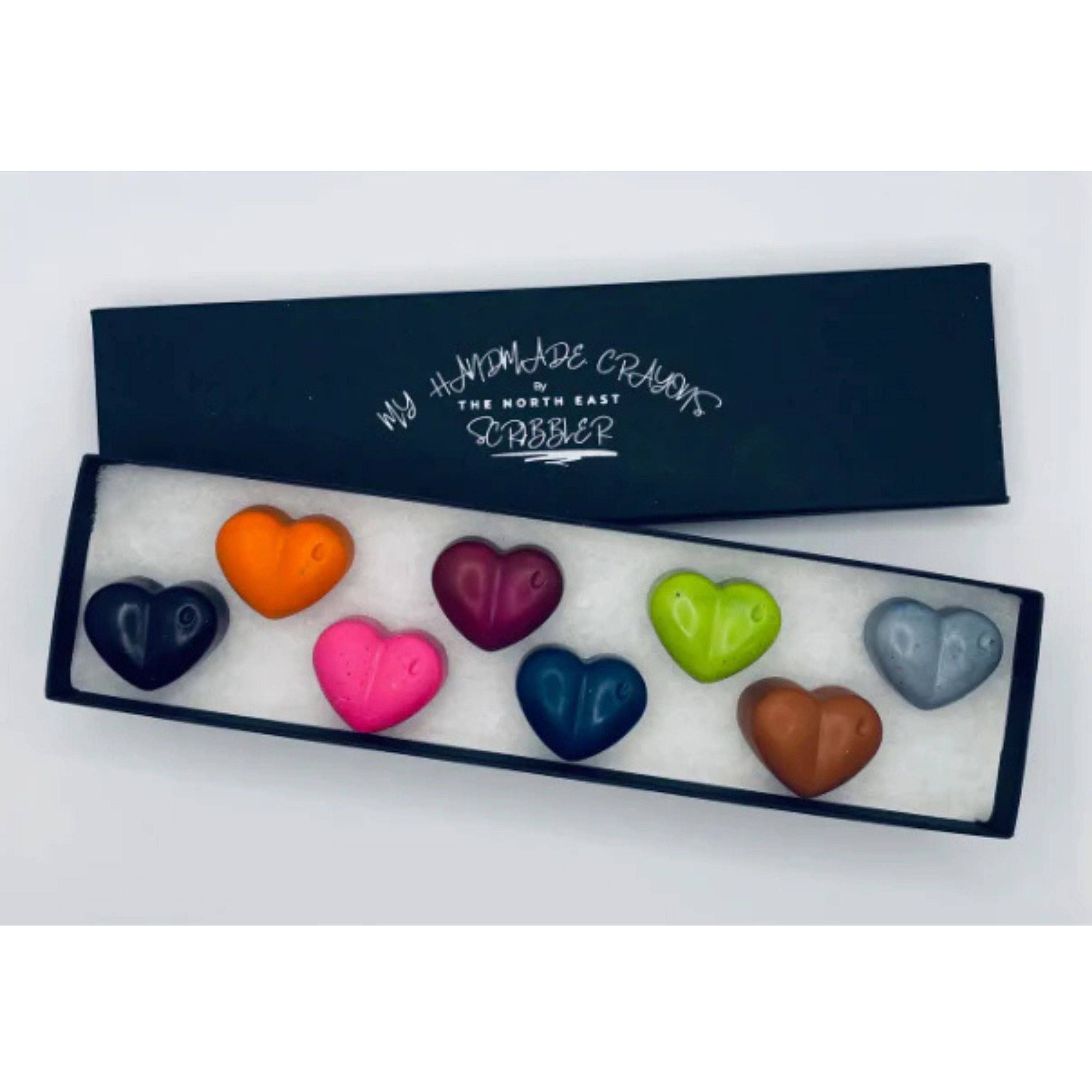 A selection of heart shaped, hand poured vibrant wax crayons. Beautifully packaged in our Kraft box with branding add a keepsake colouring bag or Scribble pad for the perfect gift ! Colours in each pack may vary but always compliment. They are hand poured from high quality, non toxic, UKCA certified wax.
