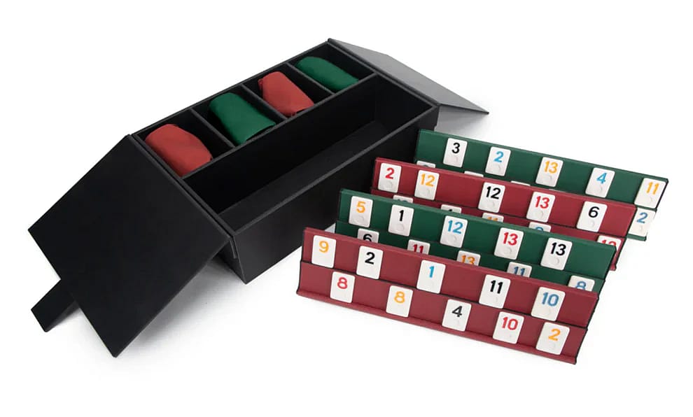 This Rummikub Set is presented in a compact and elegant box. This set includes four Rummikub racks and tiles with bold printed numbers in four velour pouches. This set has all the elements that make a great game: its easy to learn and fast moving, its different every time its played, it combines luck and strategy, and it changes quickly so every player has a chance to win until the very end.