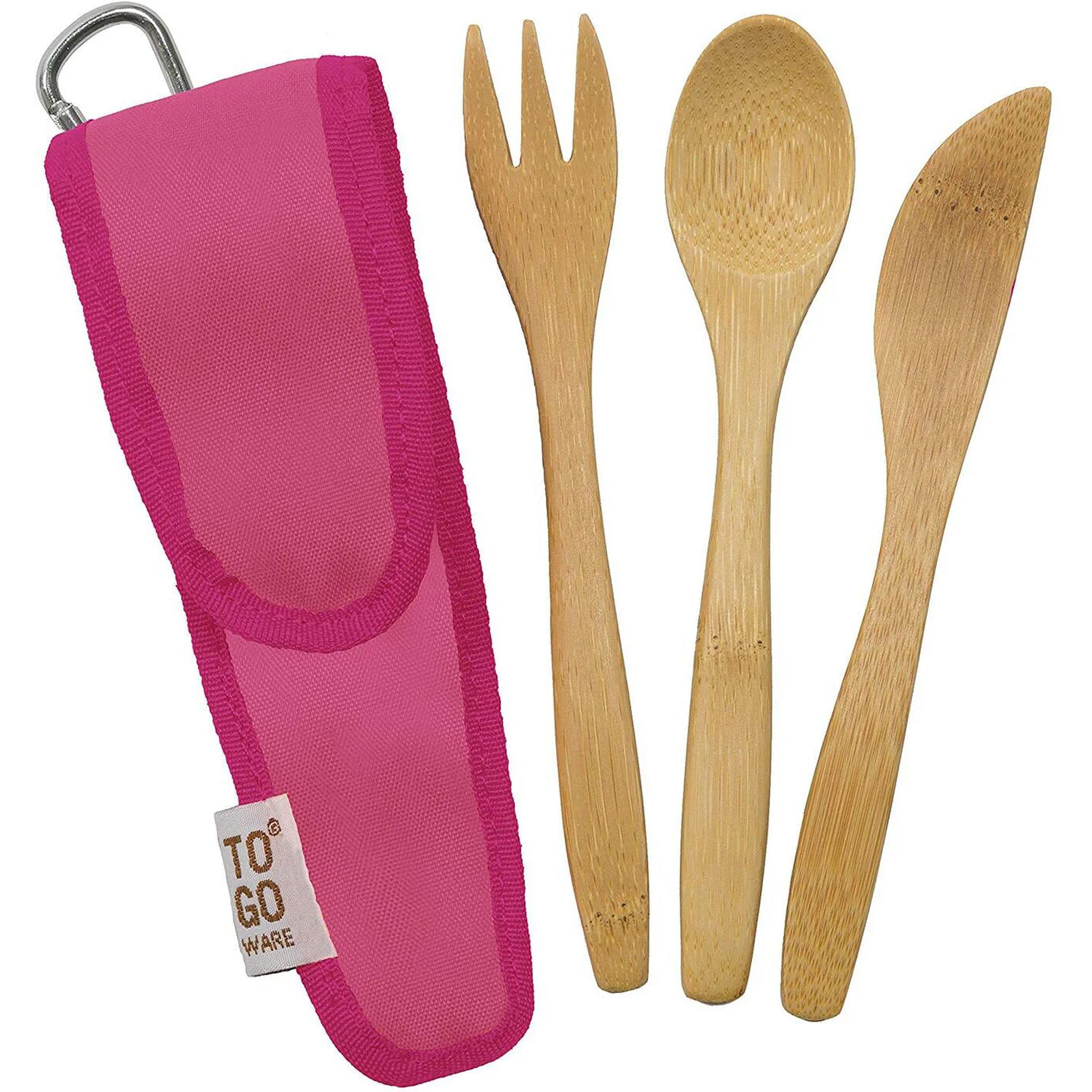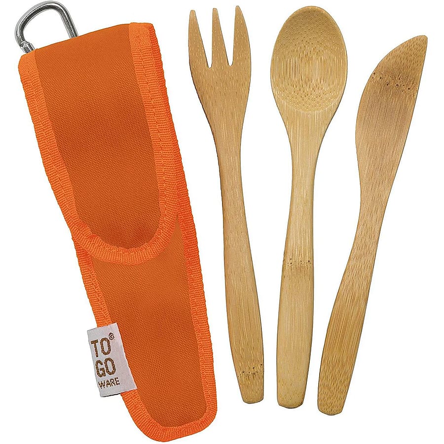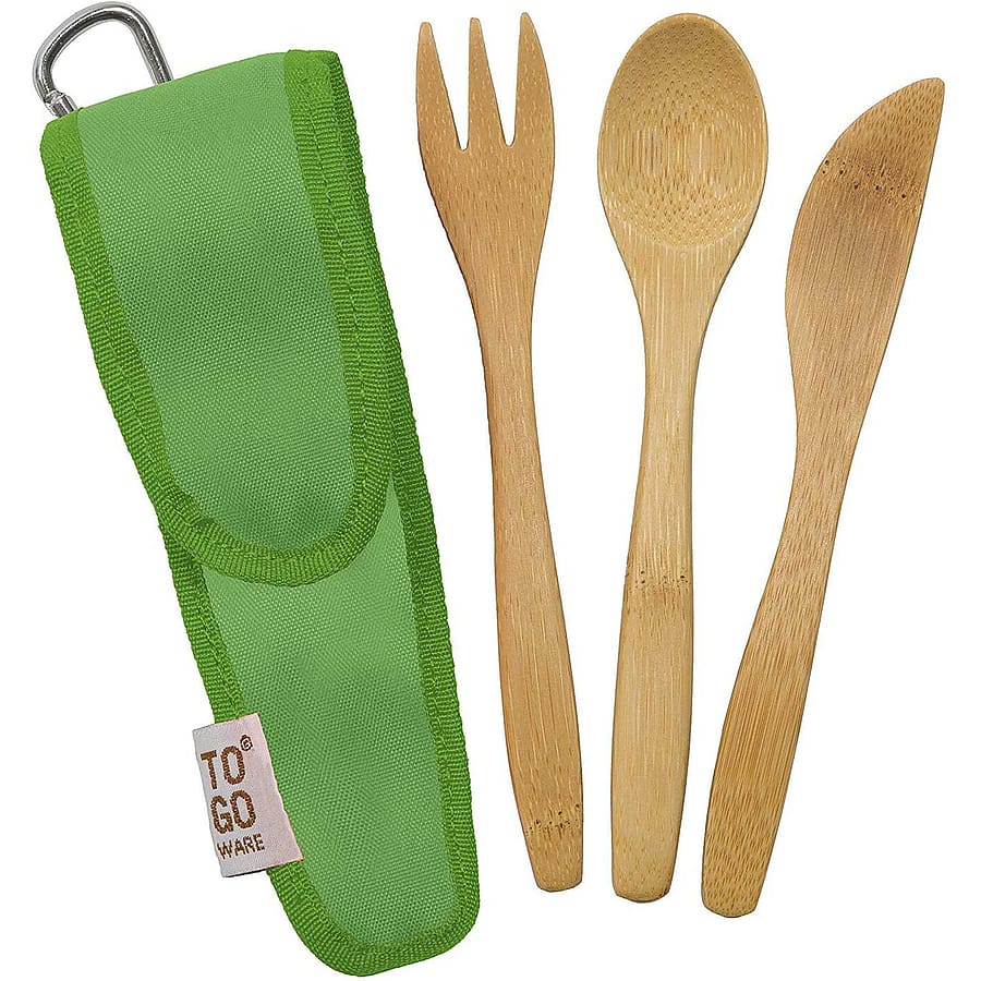 This cutlery set includes a bamboo fork, knife, spoon. The bamboo is heat and stain resistant that won't absorb flavors. The set is neatly packed inside a carrying case that is made from recycled plastic bottles.