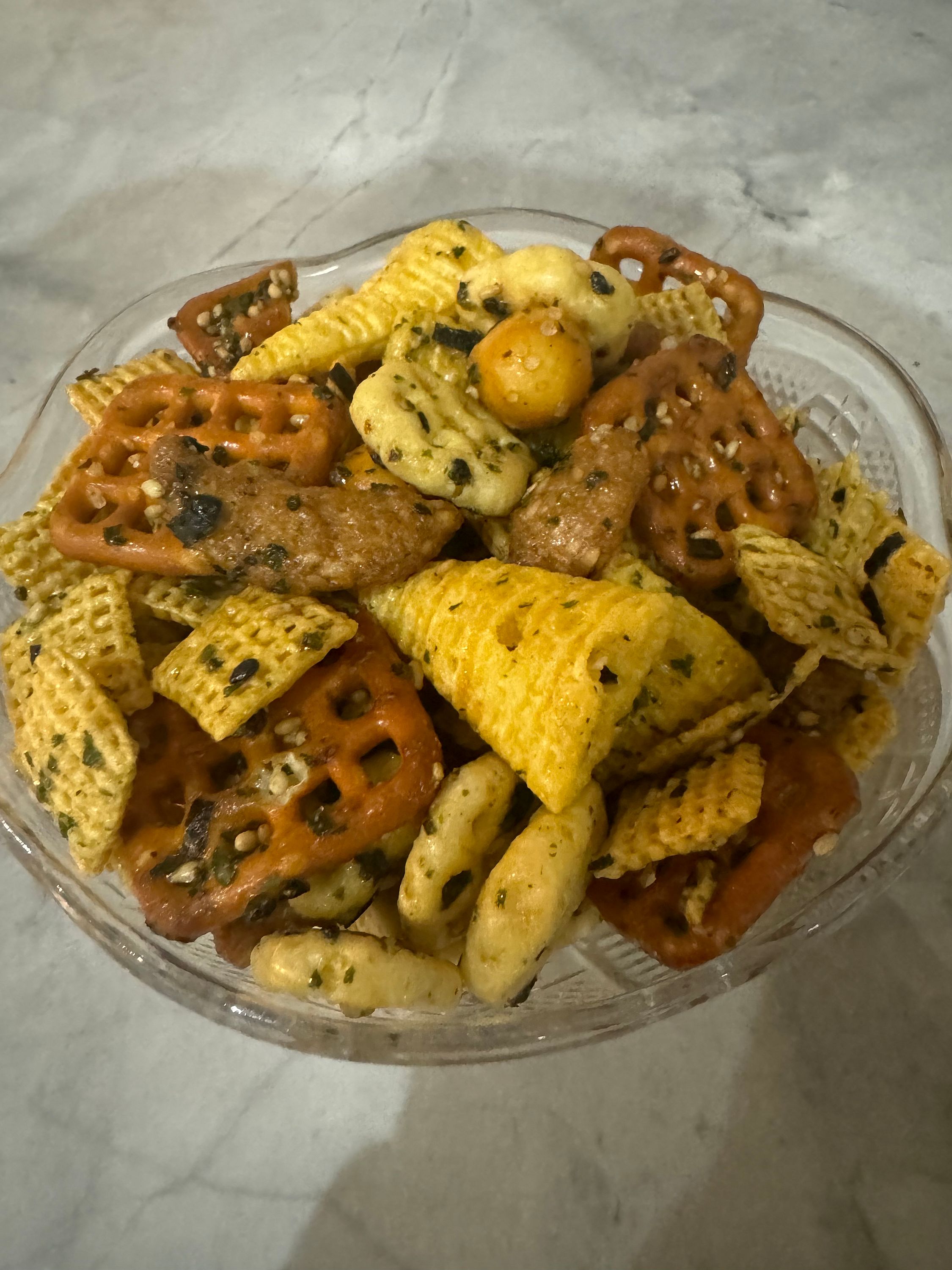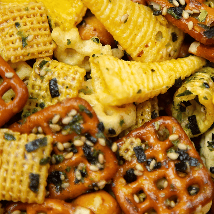 A crunchy snack mix featuring a great mix of crunchy pretzels, sesame sticks, corn cereal, corn snacks and a special blend of Japanese seasoning with a hint of sweetness for a delightful munch. Contains dairy, soy, wheat and sesame.