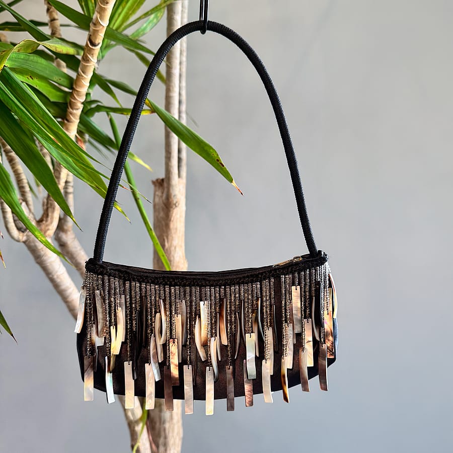 Make a bold statement with this Black Mother of Pearl Fringe Shoulder Bag — where boho artistry meets modern edge. Handcrafted with a sleek black base and finished with cascading iridescent shell accents, this bag shimmers beautifully with every movement. The rope-style shoulder strap adds a touch of effortless texture, while the compact shape makes it perfect for both day and night. Pair it with anything from denim to an evening dress for a look that’s striking, coastal, and undeniably chic.