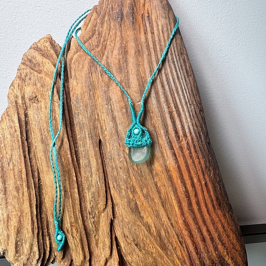 Handcrafted with care and purpose, this Adjustable Aqua Macramé Necklace features genuine sea glass collected from the coast and wrapped in vibrant aqua cord. Each piece is handmade by students at an all-girls school in Colombia, where their artistry is celebrated and students are paid for their craftsmanship. The result is a meaningful accessory that radiates both coastal beauty and empowerment.