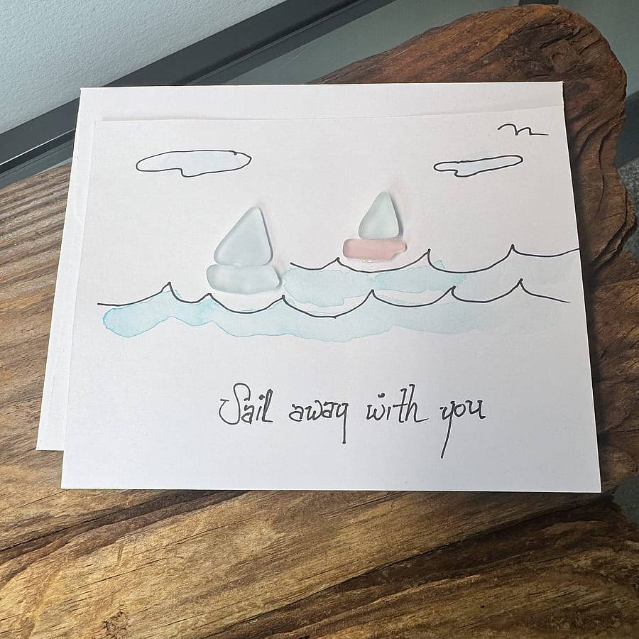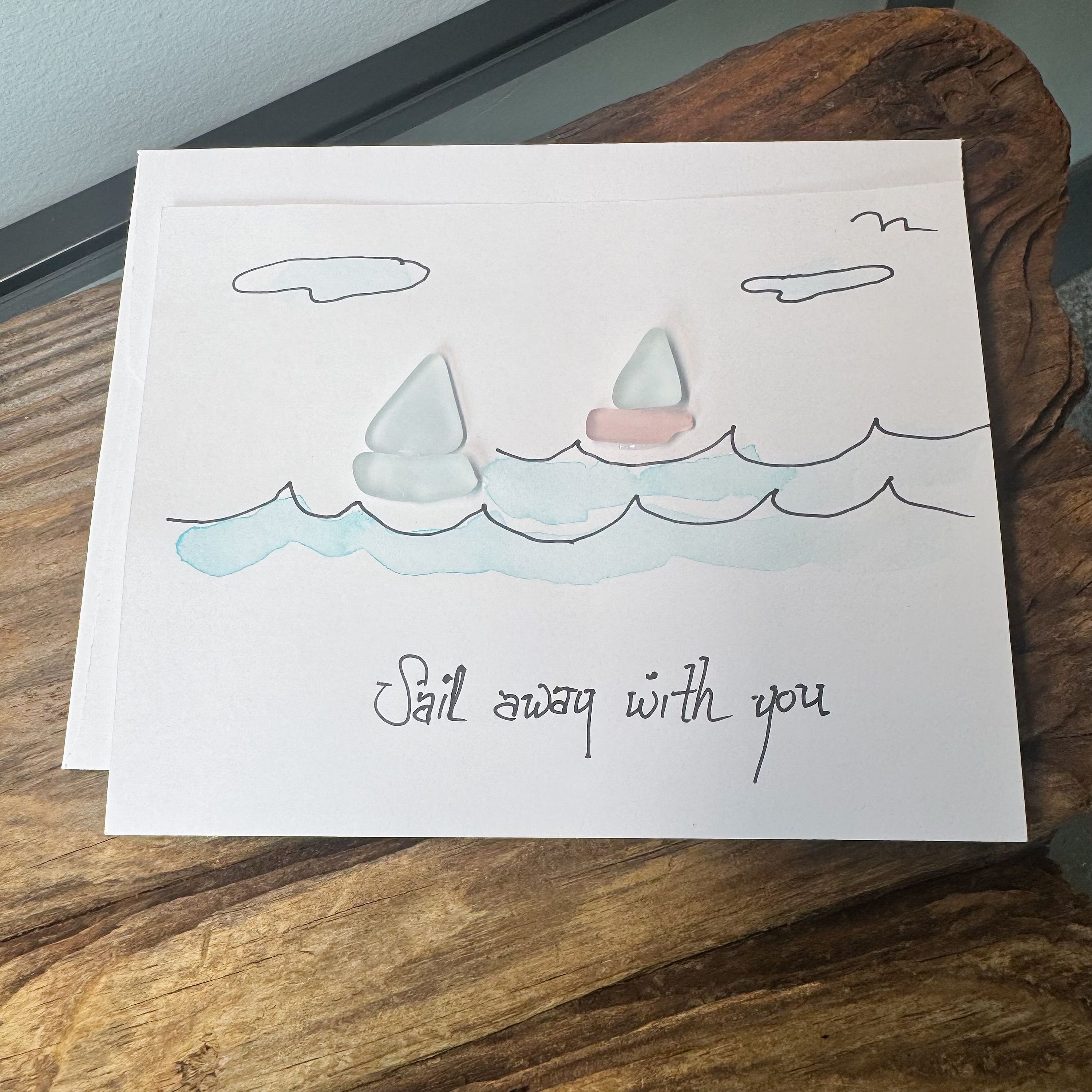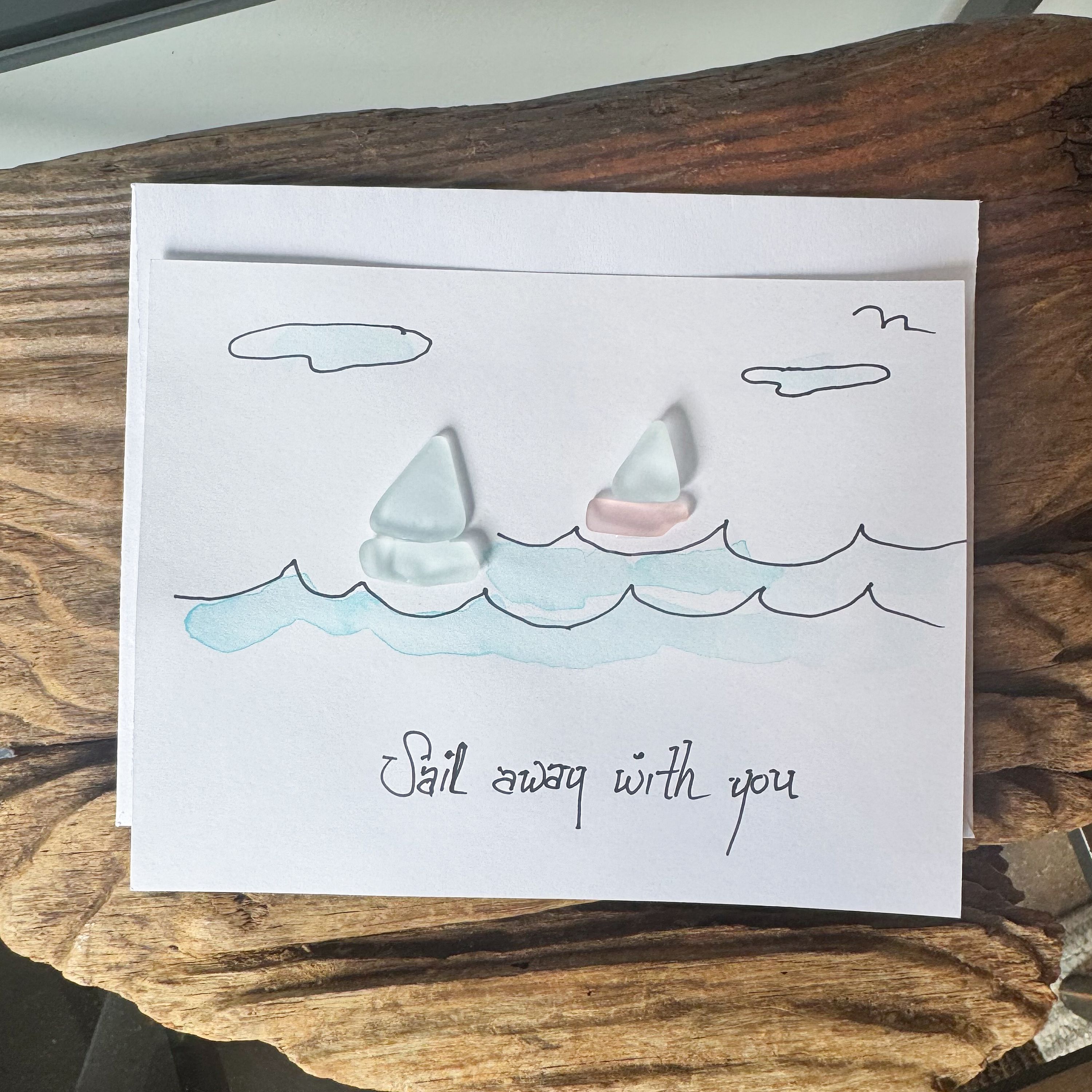 Send a little piece of the ocean with this frameable Sea Glass Card, featuring hand-placed sea glass sails in soft shades of pink and blue. Each card is delicately crafted with natural sea glass collected from the shore and paired with a whimsical sailboat illustration and the words “Sail away with you.”