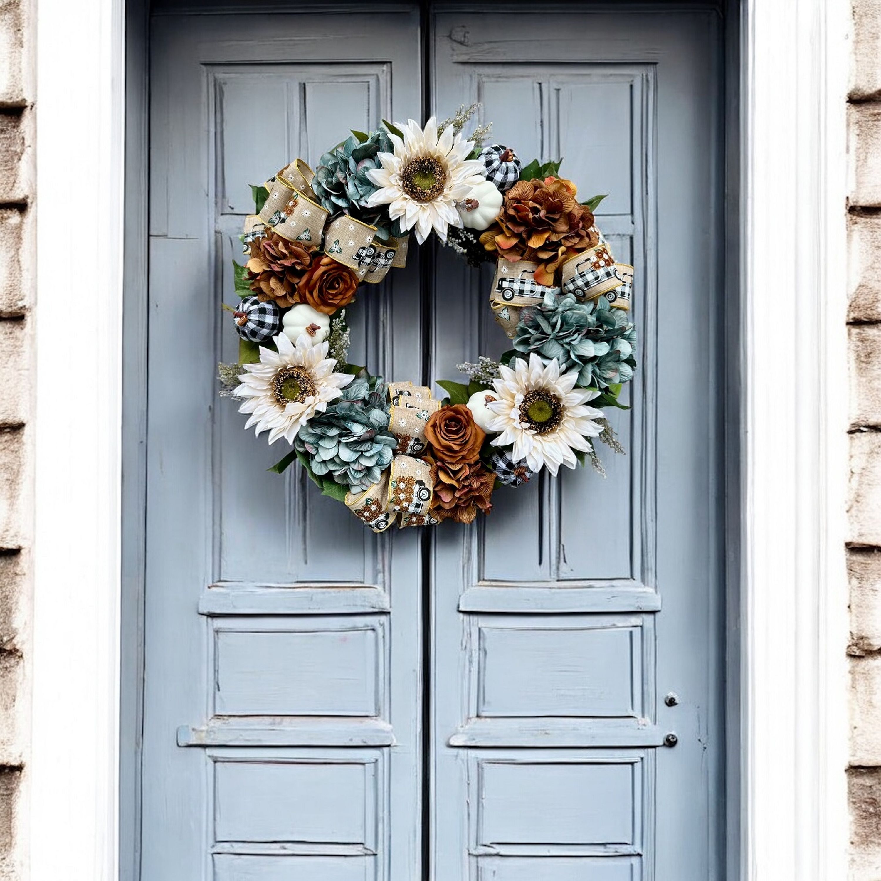 Stunning in blue, brown. and white, this autumn wreath is a standout. Designed and created with hydrangeas, roses, white sunflowers and foliage this is a unique take on an autumn wreath. Finished with 3 linen and gingham wired bows this wreath will give you great street appeal when dressed on your front door.
