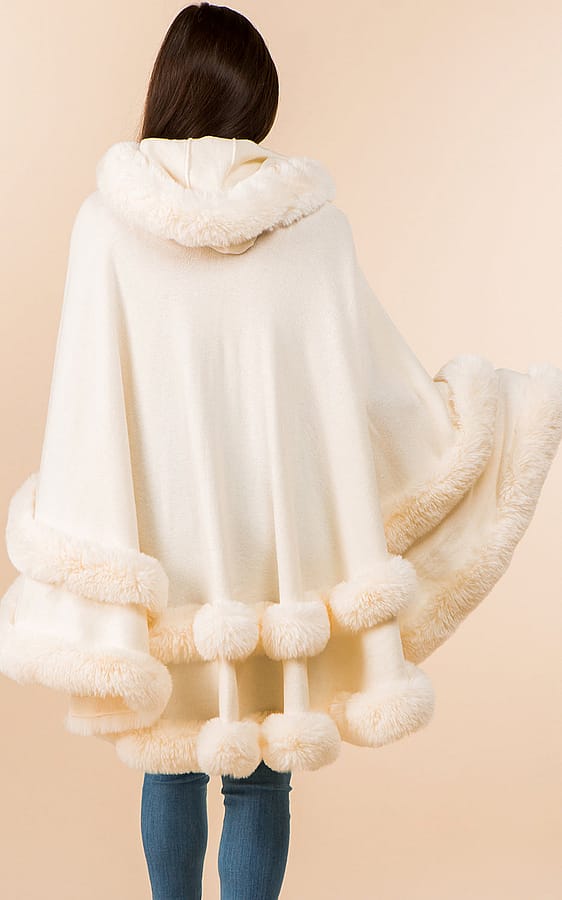 This is a winter white faux fur cape with a hood. It is trimmed with matching faux fur that feels real, without the sacrifice. This fashion accessory is perfect for the holidays whether you are dressing casual chic or dressing up.