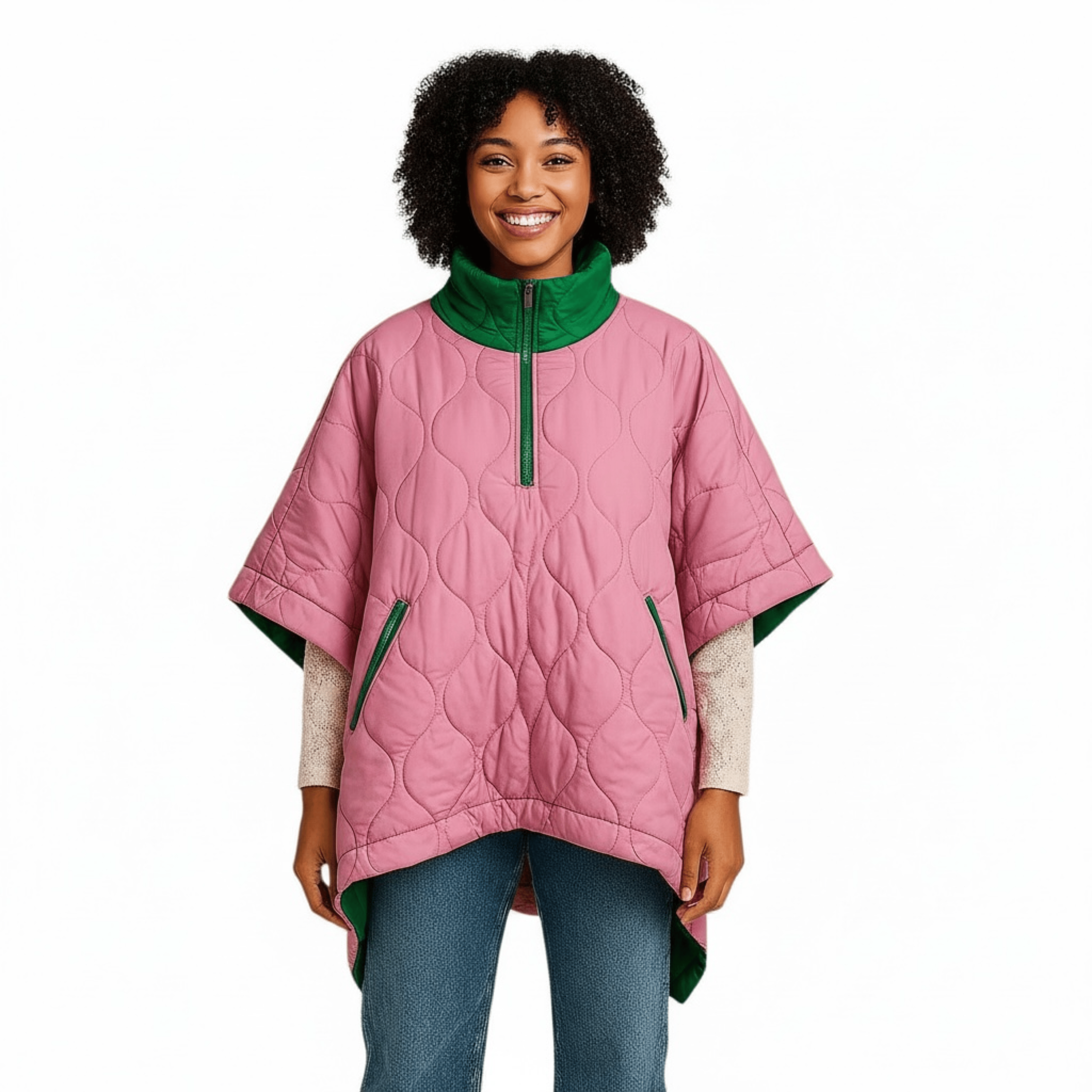 Half zip poncho fashioned in pink quilted fabrics trimmed in green. One size fits many.