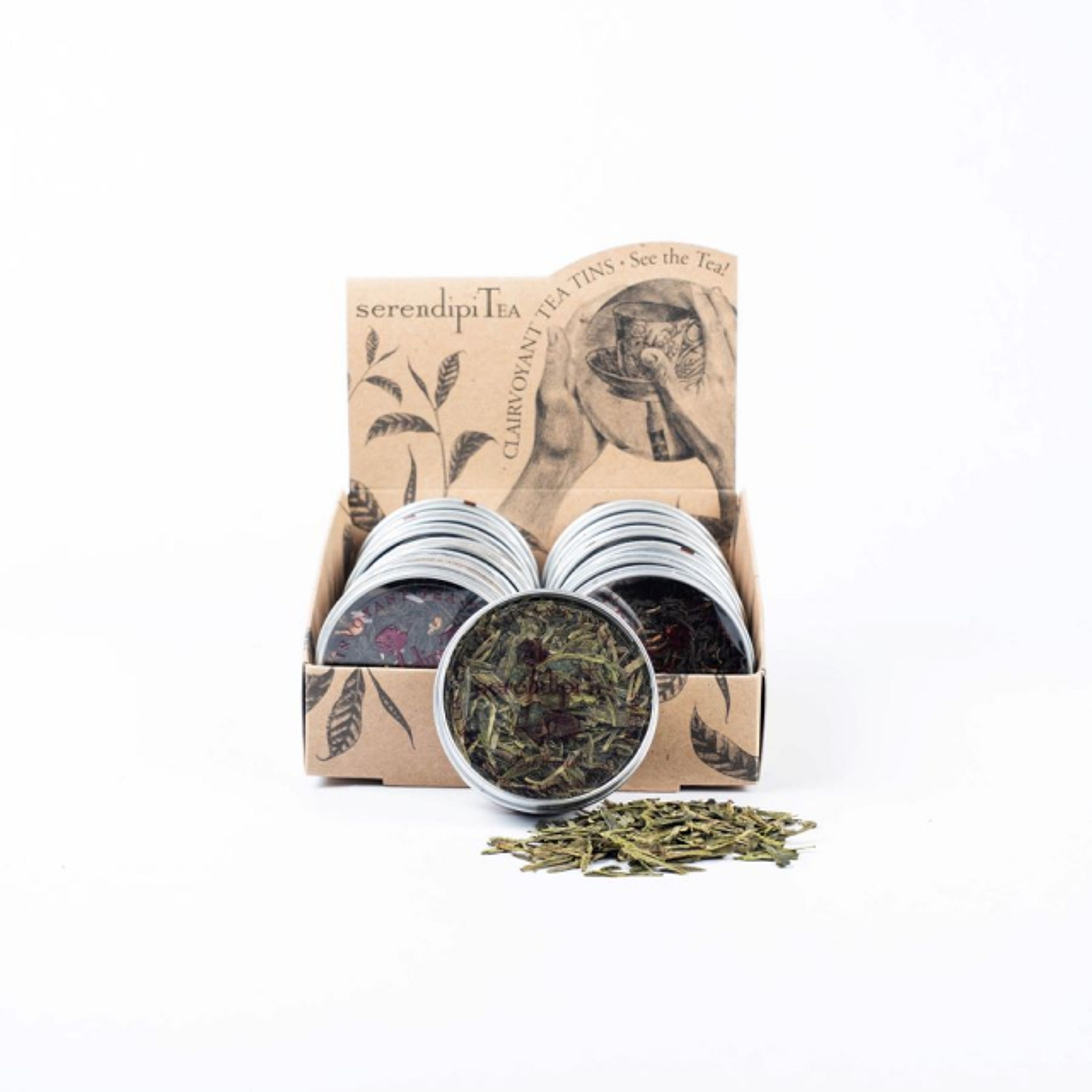 A generous assortment of 12 Clairvoyant Tea Tins (.75-1 oz samplers) in SerendipiTea's signature PCW-Kraft carton for neat cupboard storage or for home counter-top display. Great Gift Idea ~ the wide variety ensures that there is something for everyone!