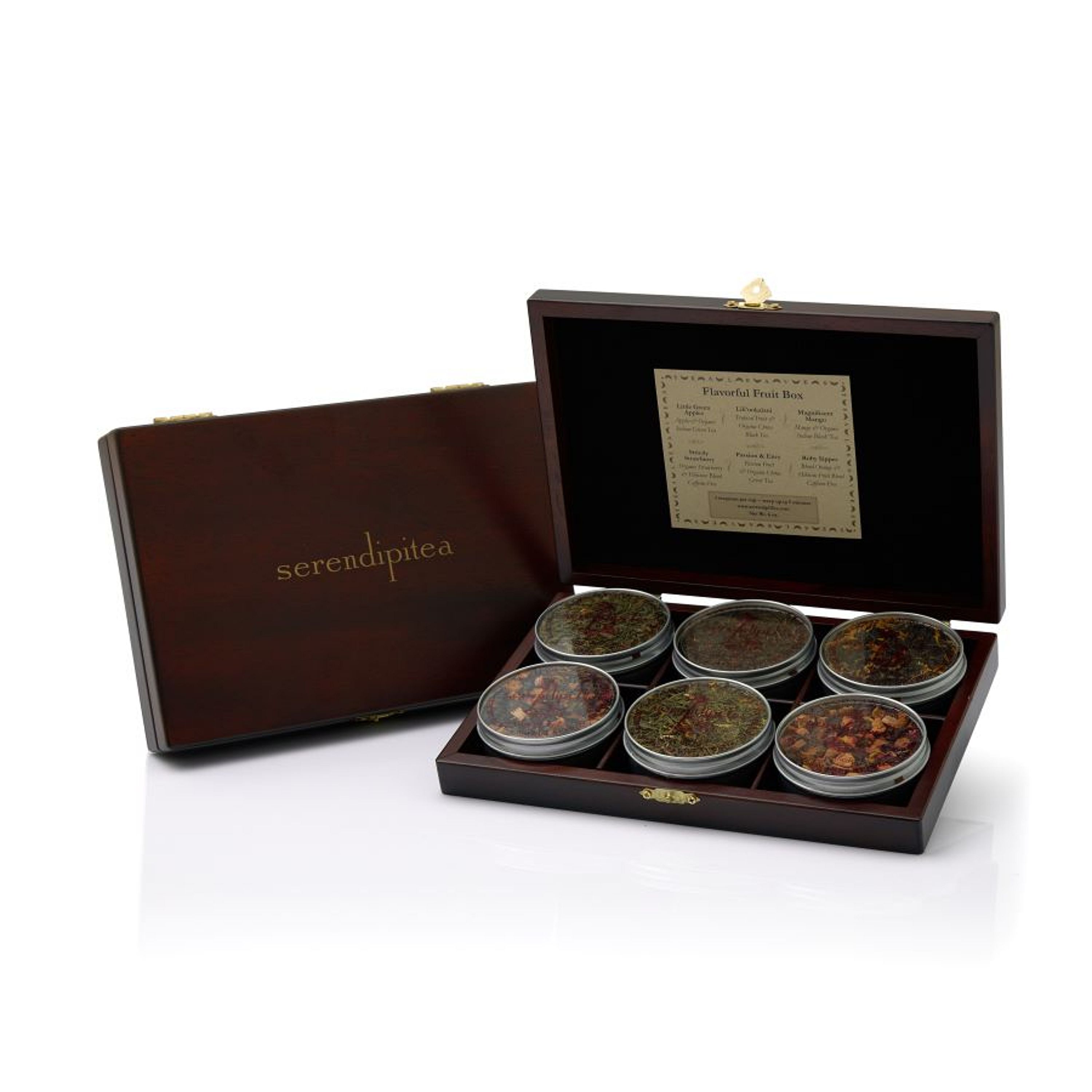 Delicious assortment of 6 Fruit Tea & Tisane Blends. Packed in attractive, refillable clear lid tins & presented in a handsome, wooden display box (9.5" x 6.25" x 1.5").