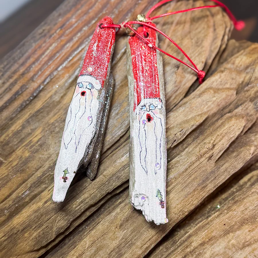 Bring rustic coastal charm to your holiday décor with these handcrafted driftwood Santa ornaments. Each piece of driftwood is naturally weathered by the sea, then hand-painted with a charming Santa face, complete with a long snowy beard, holly berries, and touches of festive shimmer.