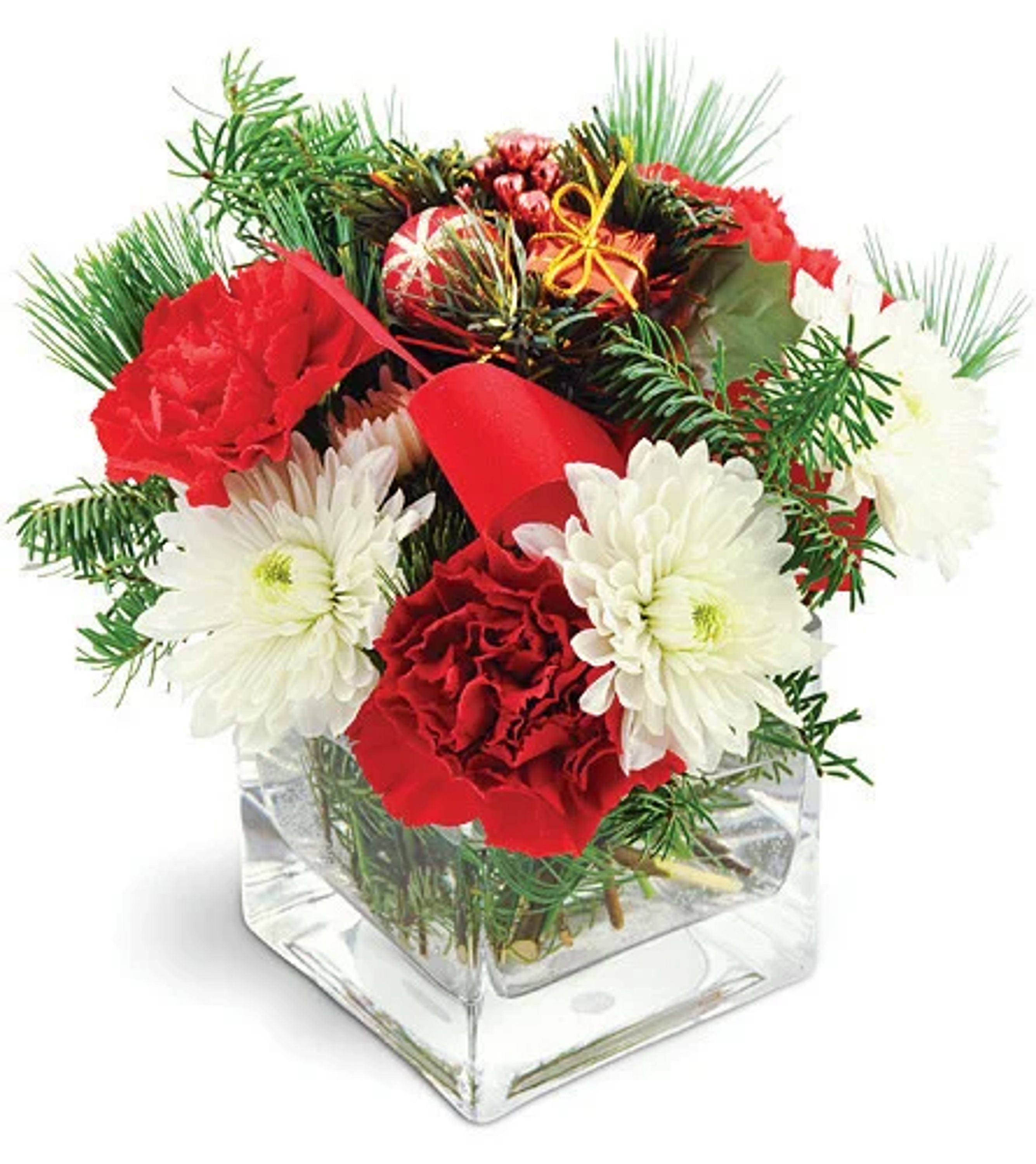 White chrysanthemums and deep red carnations are accented with evergreens, and holiday baubles in a classic glass cube.