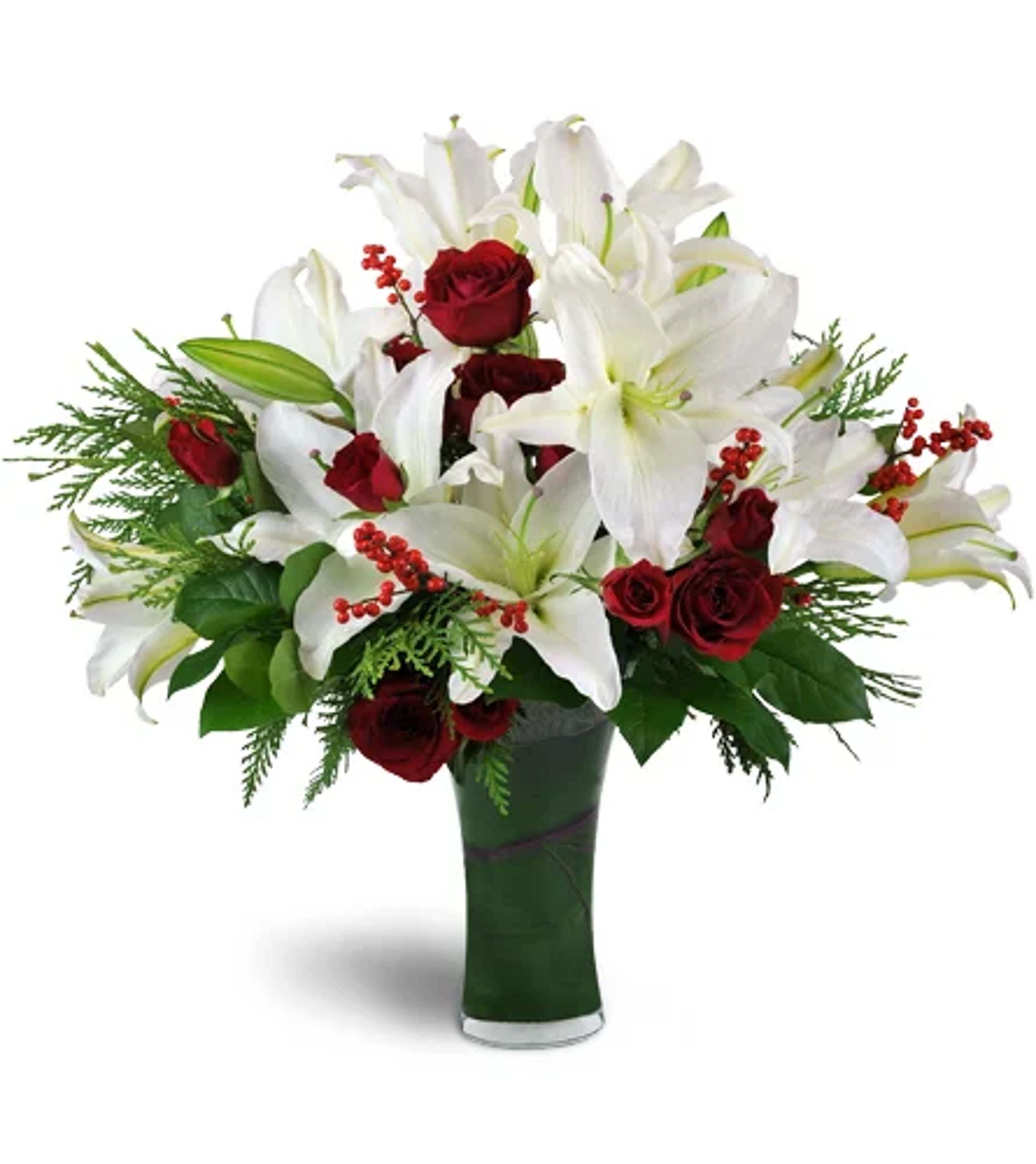 White Oriental lilies and red roses are arranged with spray roses, berries, and evergreens in a clear glass vase.