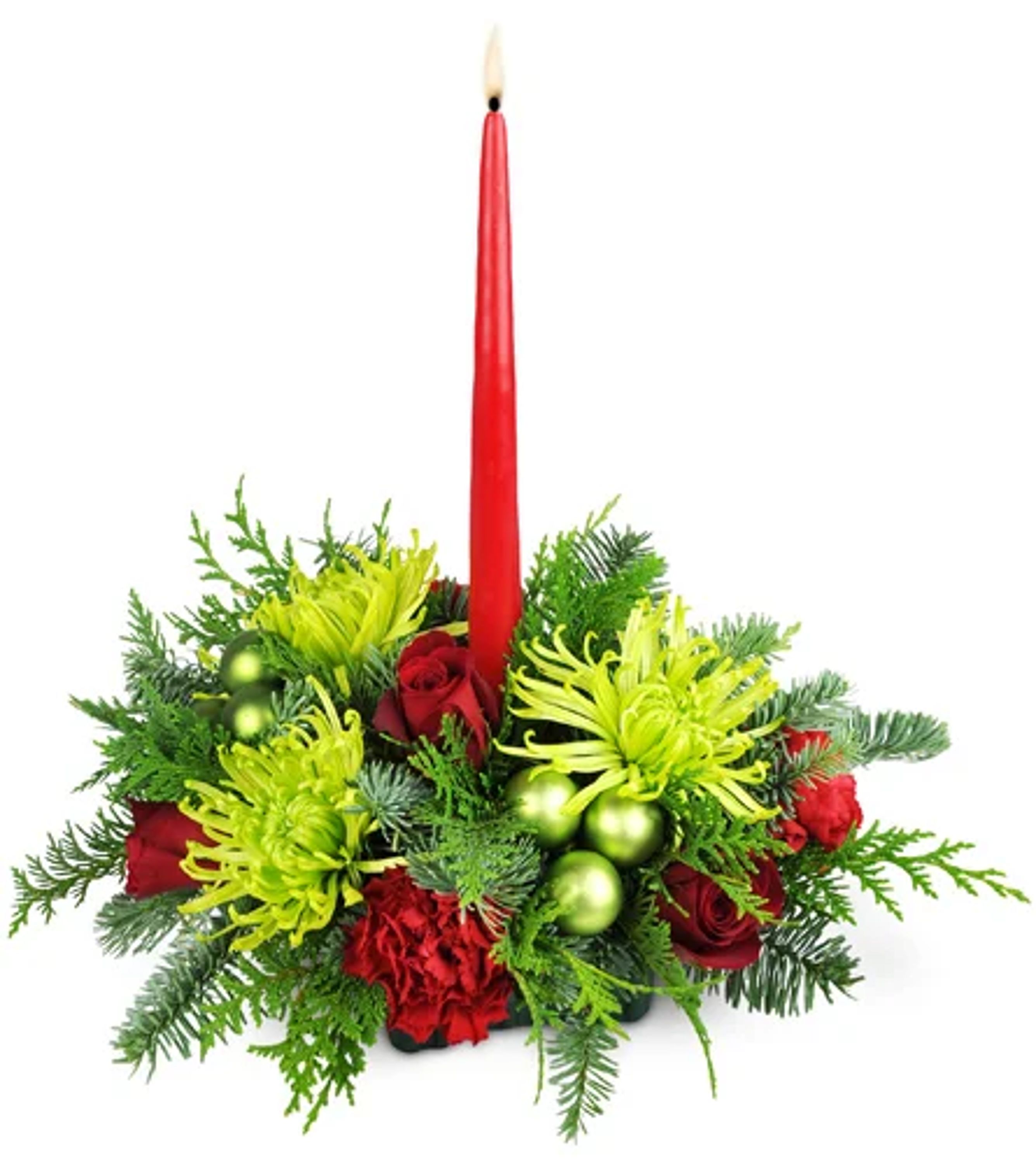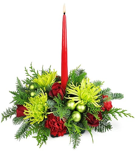 Roses, Fuji mums, and fiery red carnations are topped with a single red taper candle and cheery holiday baubles.