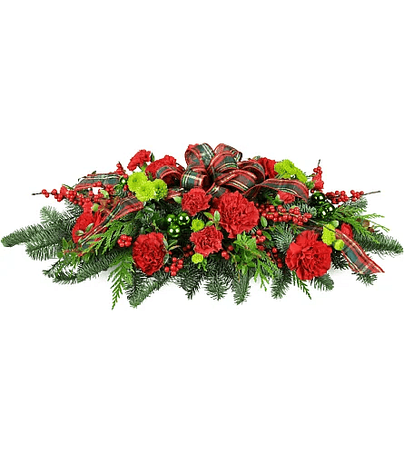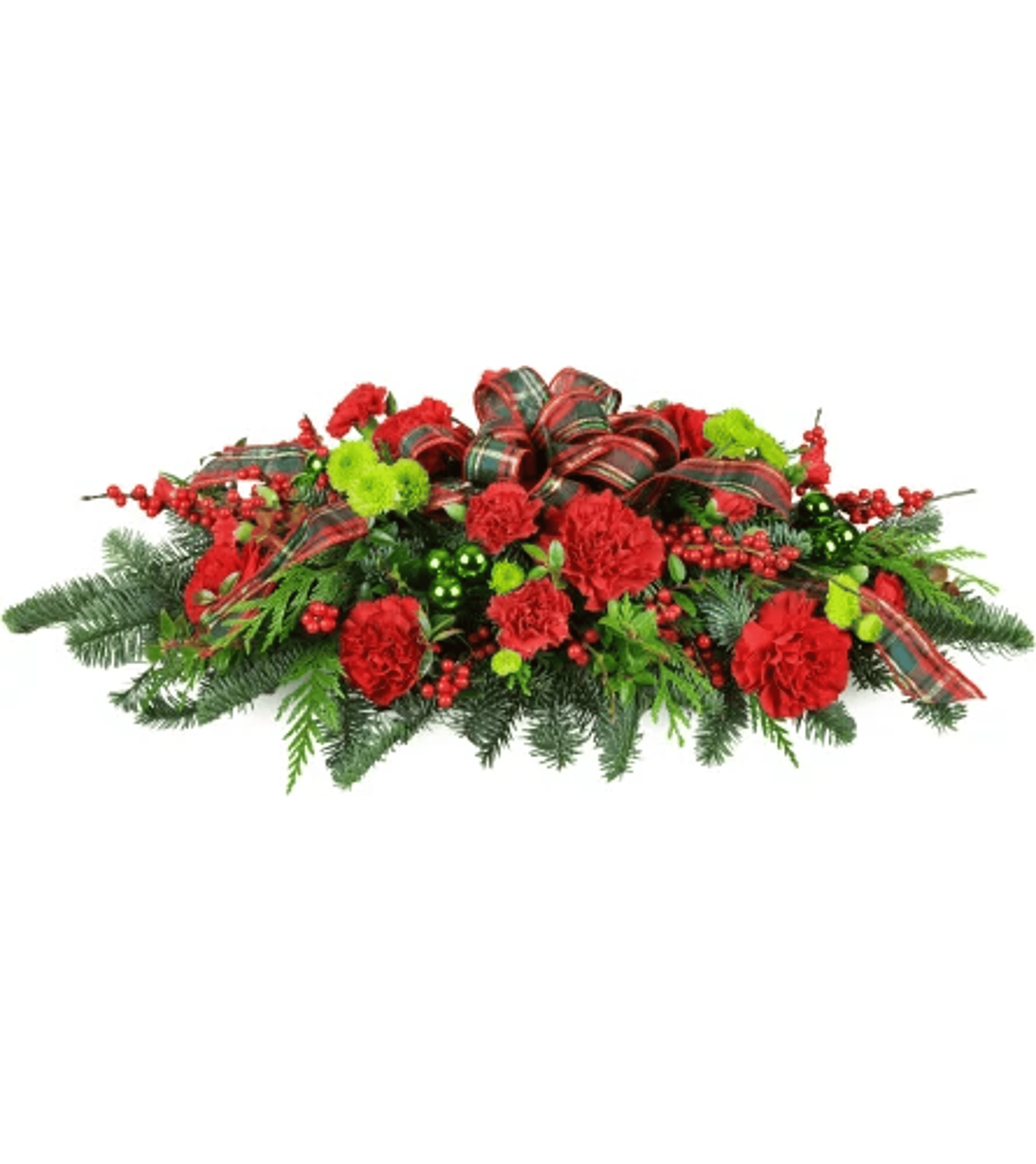A classic swag is arranged with red carnations, green baubles, balsam, cedar, and more.