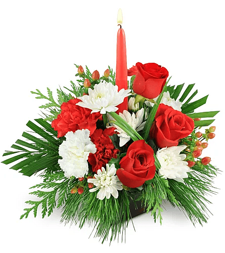 All is calm, all is bright. Bring serenity and beauty to those you hold dear by surprising them with this delightful centerpiece. Red roses, carnations, berries, and more are topped with an elegant taper candle.