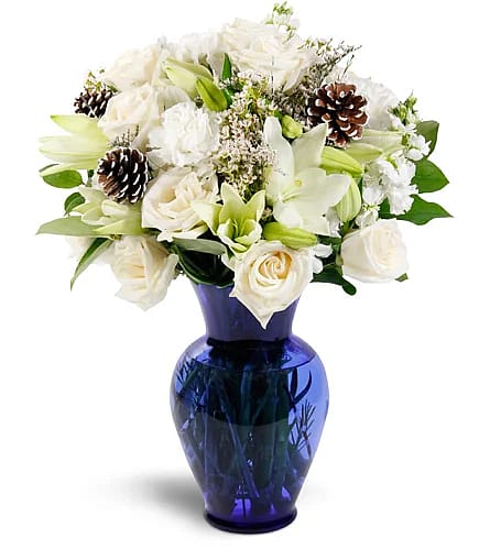 Creamy white roses, lilies, carnations, and more are festively arranged with pinecones in a blue glass vase.