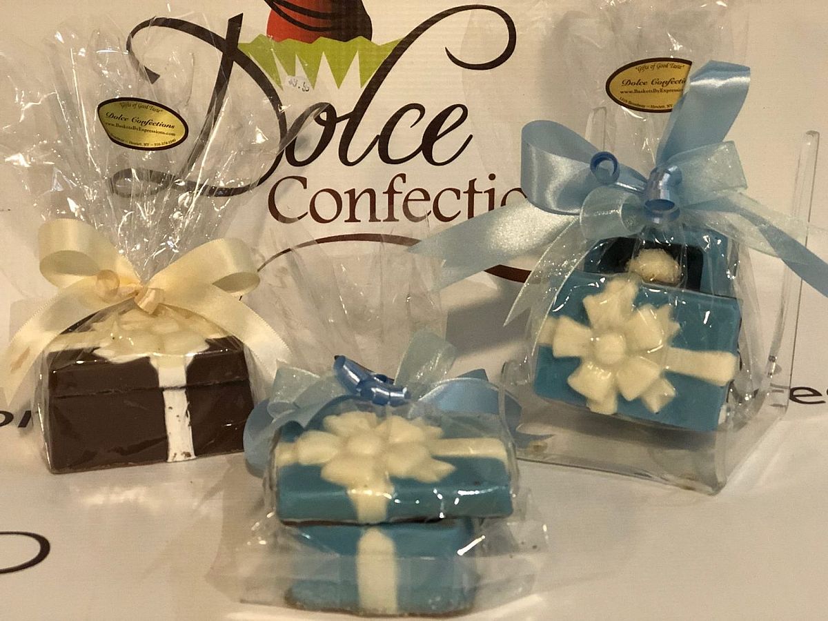 Wedding ring boxes made of solid chocolate measuring 2 3/4″ x 2″ x 1 1/2″ with a chocolate diamond ring inside. For colored box please specify desired color in notes at check out.