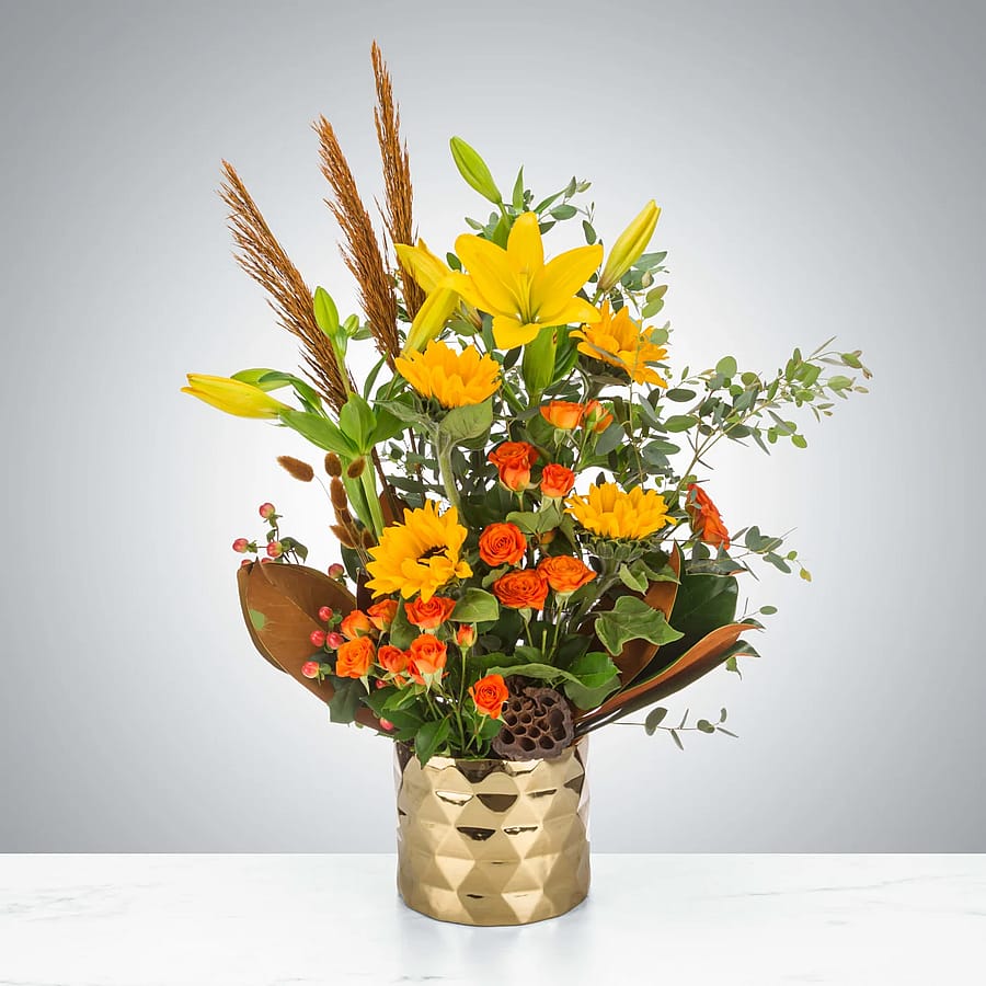 Autumn glimmer is a quintessential fall arrangement featuring a gold architecture vase and a variety of fun fall flowers and accents. This arrangement is pure fun and elegance with a vase that the recipient will surely re-use. Send this to impress! Perfect for the autumn equinox, Halloween or Thanksgiving.