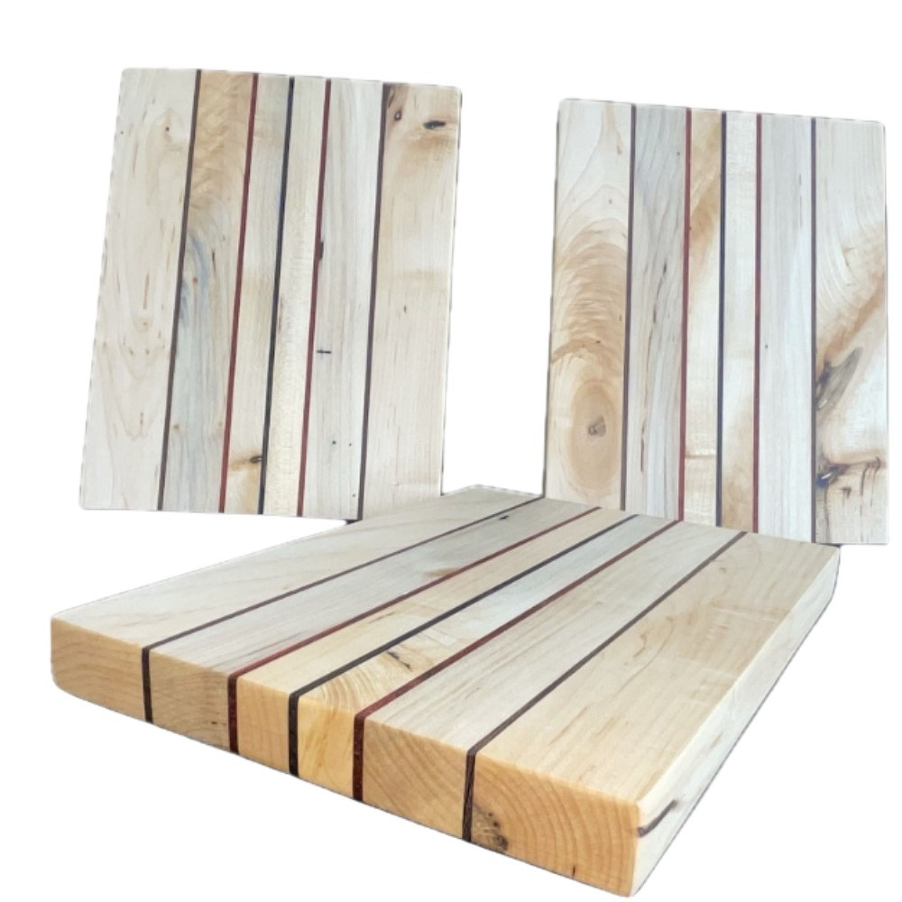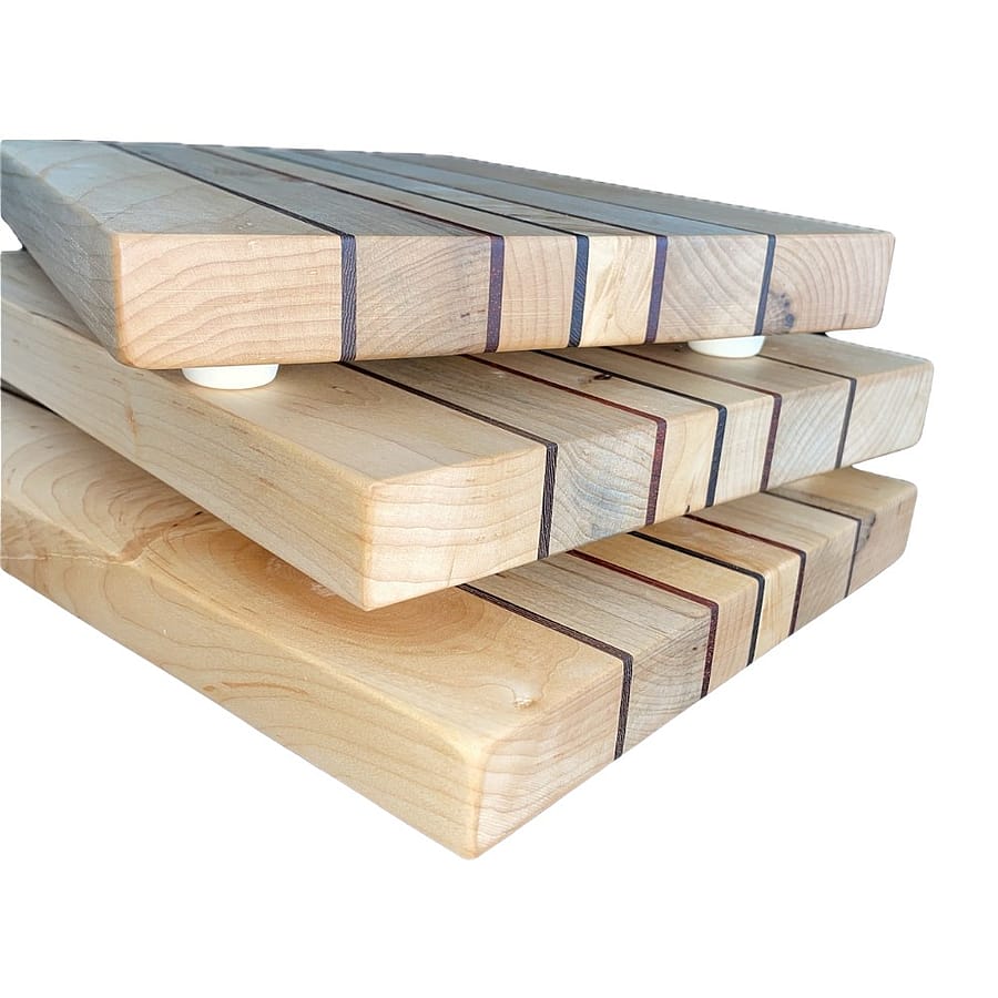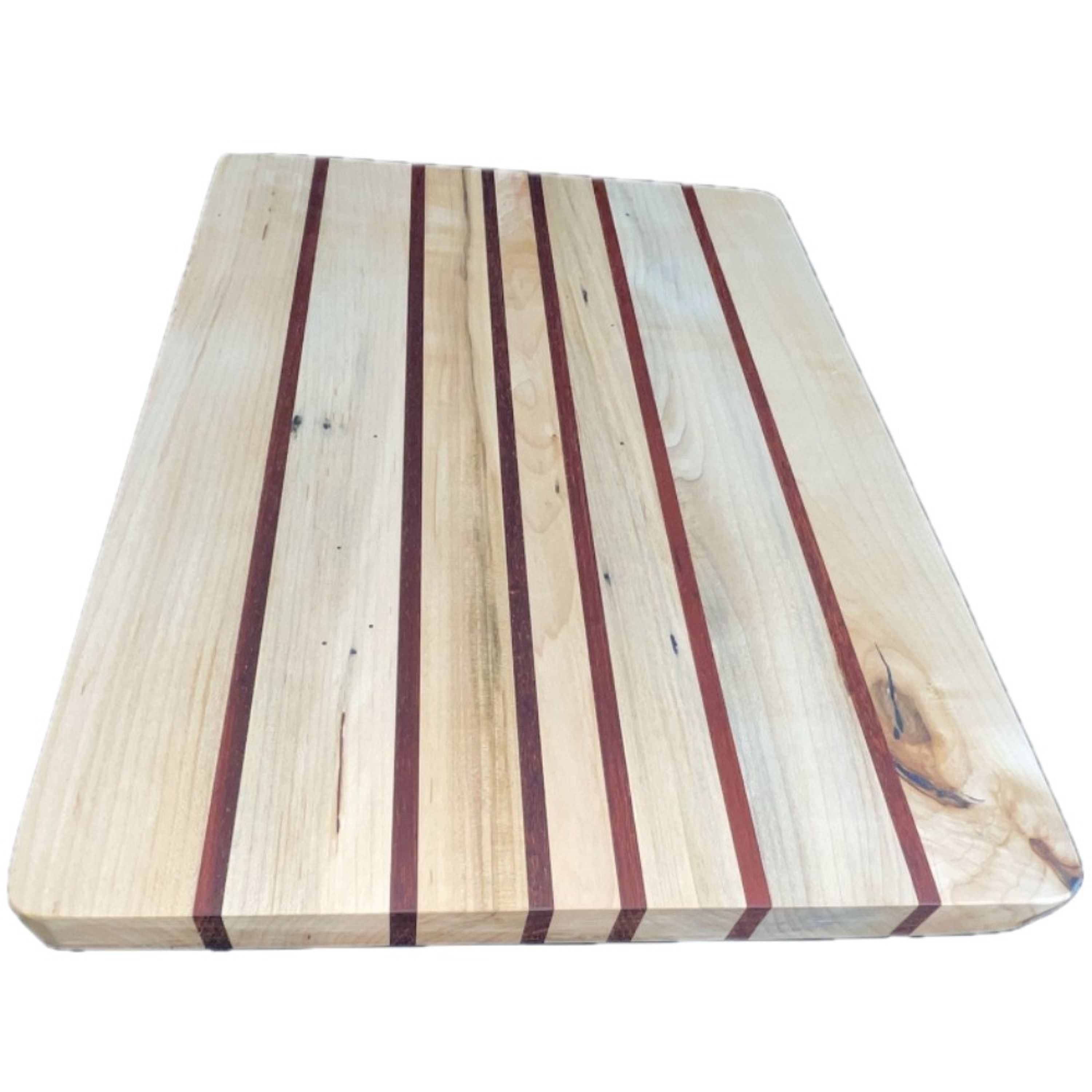 This Cutting board is made with Hard Maple as well as thin strips of Padauk. Each cutting board has Rubber mountain feet rubber mounted feet that allow it to stand off any surface. Each and every cutting board is treated with a in house produced cutting board conditioner that consists of beeswax carnauba wax and mineral oil. It is always recommended that every natural wood cutting board is treated with a food grade wood conditioner either once every few months or as needed depending on usage.