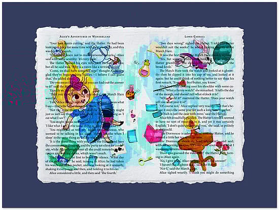 Original creative design layered over authentic book pages, capturing the essence of literature and art. Perfect for book lovers and avid fans of Alice's Adventures In Wonderland by Lewis Carroll. ☕ Vintage style premium inkjet art print ☕ Handmade cotton paper with deckle edge ☕ Float mounted to a durable mat board