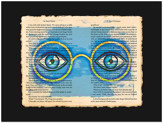 Original creative design layered over authentic book pages, capturing the essence of literature and art. Perfect for book lovers and avid fans of The Great Gatsby by F. Scott Fitzgerald.