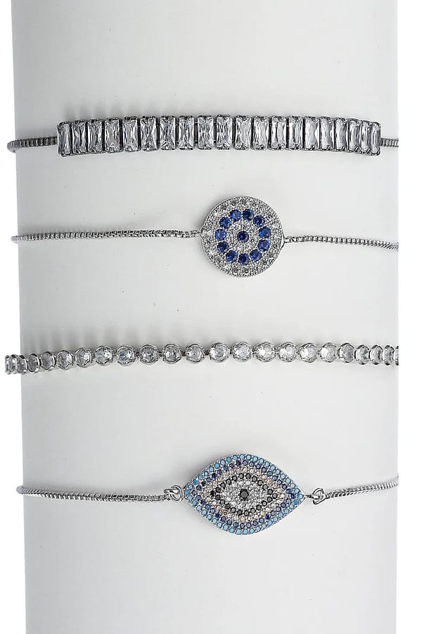 This elegant set of bracelets allows for mixing & matching. We love cubic zirconia bracelets for an evening out and the evil eye charm bracelets for casual looks. Metal: Brass Stone: Cubic Zirconia Clasp: Bolo Ball