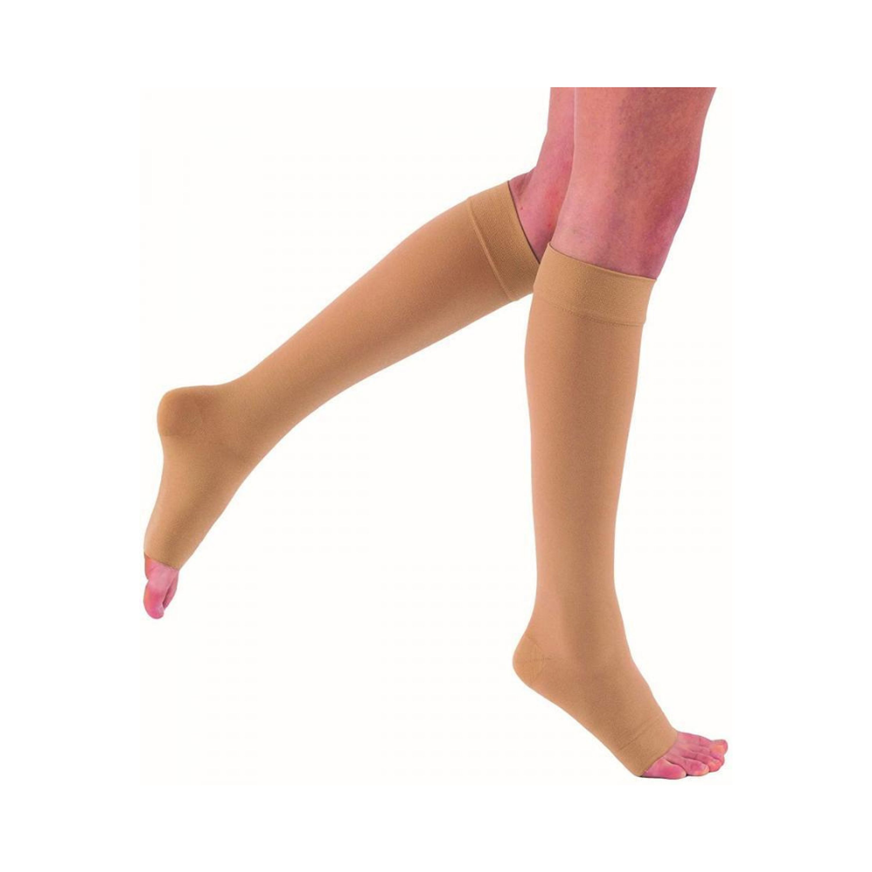 Jobst Relief Compression Stockings are designed to produce graduated sustained compression and feature an open toe design; latex-free construction that reduces skin irritation; 3-D knit structure using air covered spandex yarn that is soft to touch and comfortable for all day wear; and a reinforced heel designed for long lasting durability. These stockings are ideal for swelling; heaviness and fatigue in the legs; standing or sitting for prolonged periods of time; prevention of venous disease; treatment of venous systems; symptoms during pregnancy; and fashionable everyday compression wear.