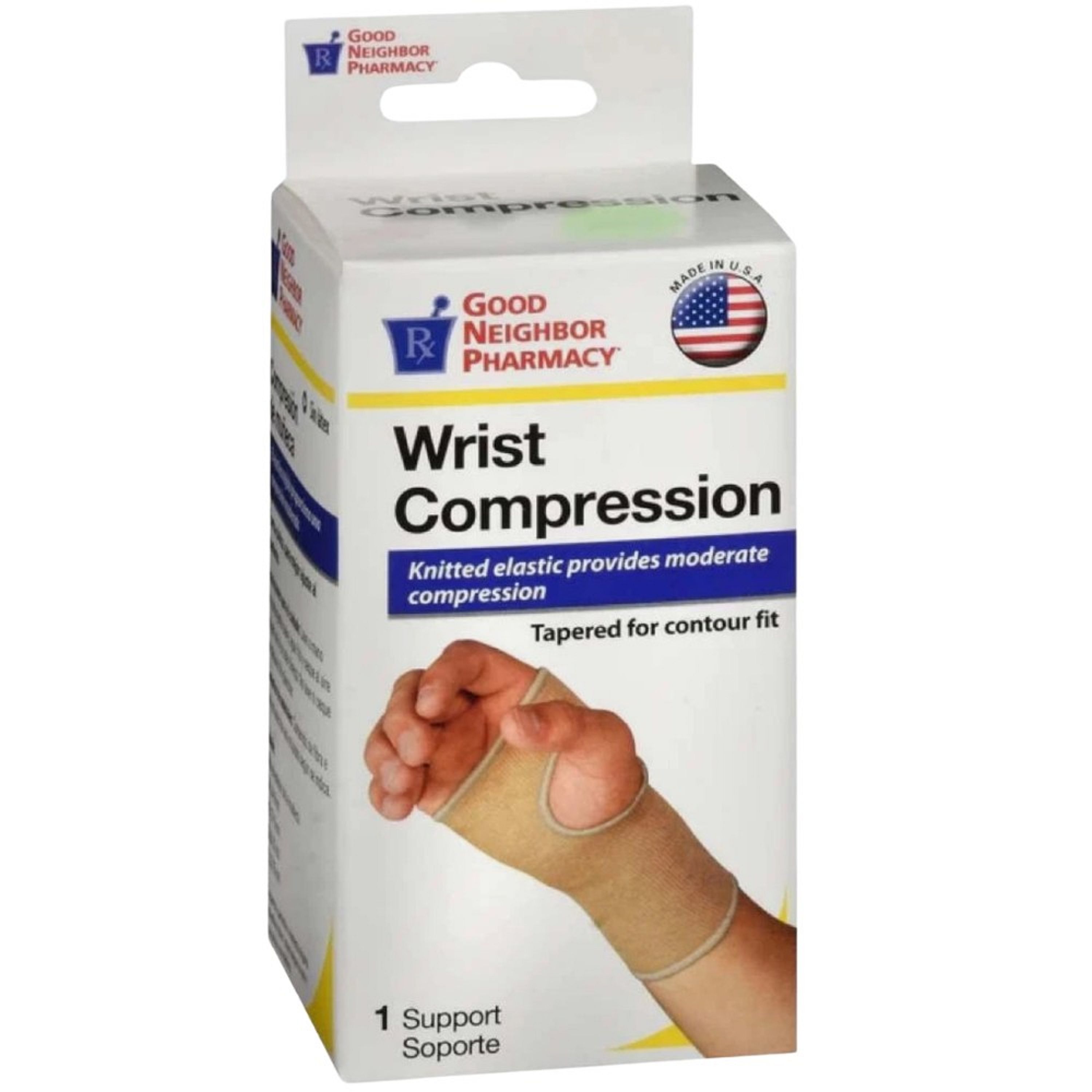 The Good Neighbor Pharmacy Wrist Compression Support is designed to provide gentle compression and support to help stabilize the wrist during everyday activities. The compression helps improve comfort while supporting weak, strained, or overused wrists. Made with flexible and breathable materials, the support fits comfortably around the wrist while allowing natural movement of the hand and fingers. The neutral beige color makes it discreet for everyday wear under clothing.