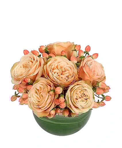 This delicate bouquet is simply stunning! Featuring lovely coral roses and peach hypericum, Cozy Coral is sure to be a timeless classic. Full of elegance, this tasteful bouquet is perfect for any occasion. Order it today!