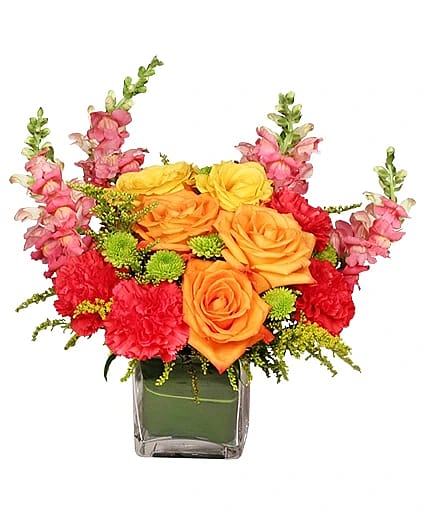 Cube Vase, Foliage: Aspidistra Leaf, Peach Talisman Snapdragons, Hot Pink Carnations, Yellow Roses, Orange Roses, Green Kermit Button Poms, Solidago.