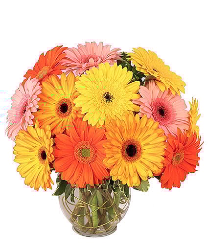 Put on your dancing shoes and get ready to dance around this fun floral design! With a mix of orange, yellow, and pink flowers, Groovy Gerberas makes the perfect pick-me-up! This bright and vibrant design is sure to make their day today.
