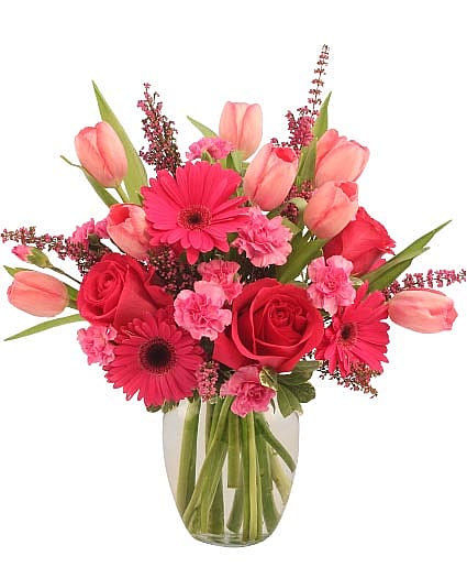 Charming and sophisticated, this sweet bouquet is a perfect choice! Featuring a stunning mix of hot pink roses, gerberas, pink tulips, mini carnations, and more, Sweet Pink Mystique is a magnificent mix bursting with color. Share the love and send some magic today with this vibrant bouquet!