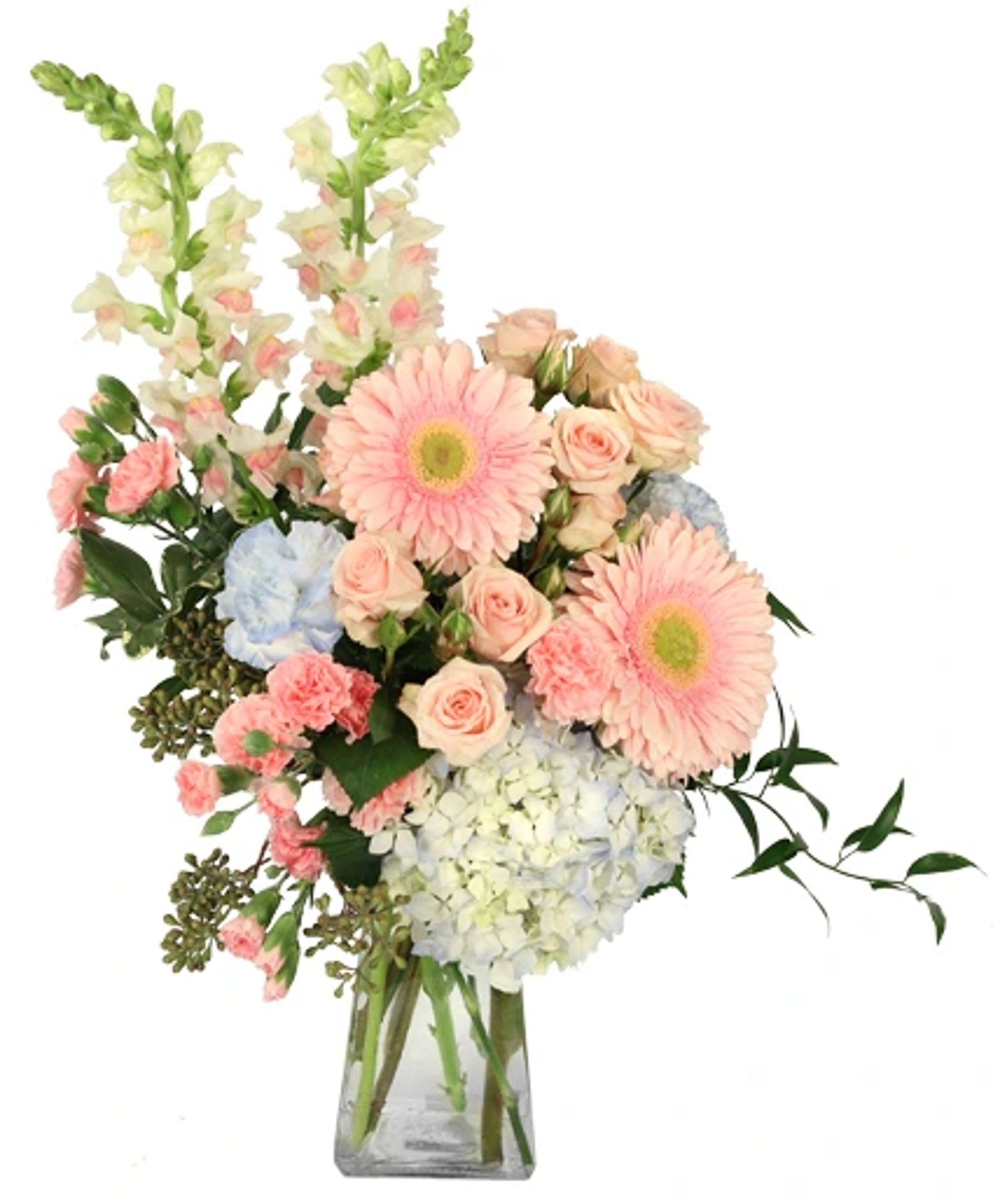 Blue Carnations, Pink Mini Carnations, Pink Gerberas, Blue Hydrangea, Pink Snapdragons, Pink Spray Roses, Greens: Seeded Eucalyptus, Variegated Pittosporum, Italian Ruscus, Square Gathering Vase.