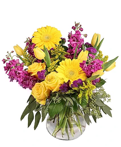 This dazzling arrangement packs a punch of color! The bright yellow gerberas, roses, and tulips contrast gorgeously with the purple stock and statice, making Jazzy Jubilee a vibrant mix. Send this lively bouquet to someone who needs a pick-me-up today!