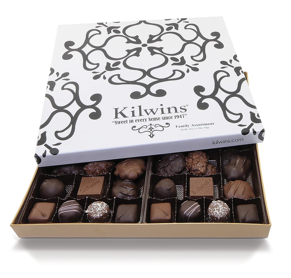 Kilwins Family Assortment is our most popular Heritage Chocolate Assortment, with something for every taste! 4 Milk Chocolate Caramels 4 Dark Chocolate Caramels 4 Milk Chocolate Pecan Tuttles 4 Dark Chocolate Pecan Tuttles 4 Milk Chocolate Coconut Clusters 4 Dark Chocolate Coconut Clusters 2 Milk Chocolate Cherry Cordials 2 Dark Chocolate Cherry Cordials 2 Raspberry Truffles 2 Irish Cream Truffles 2 Milk Chocolate Peanut Butter Smoothies 2 Dark Chocolate Peanut Butter Smoothies 2 Dark Chocolate Truffles 2 Chocolate Bon Bons 4 Milk Chocolate Peanut Clusters 4 Dark Chocolate Peanut Clusters 2 Milk Chocolate Vanilla Butter Creams 2 Dark Chocolate Vanilla Butter Creams 2 Mocha Truffles 4 Kilwins Milk Chocolate Squares