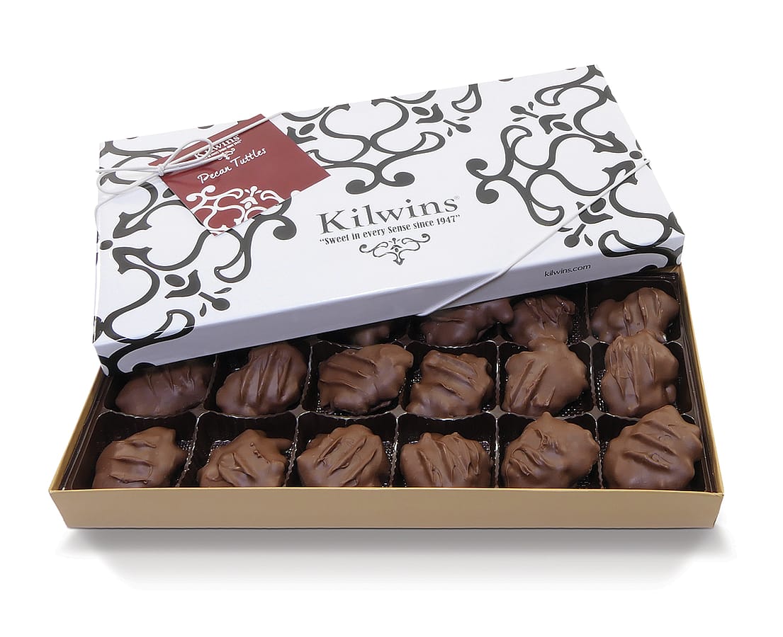 A Kilwins favorite! Fresh pecans with copper kettle-cooked & hand-crafted Caramel are coated in Kilwins Heritage Milk Chocolate. 18 Milk Chocolate Pecan Tuttles