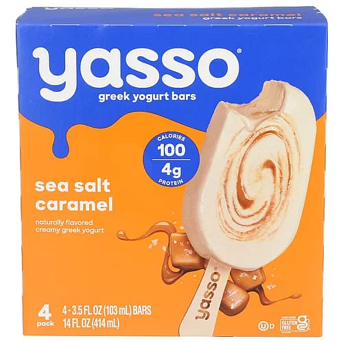 A 4‑pack of Yasso Sea Salt Caramel Greek Yogurt Bars featuring creamy frozen Greek yogurt swirled with sweet caramel and a hint of sea salt. Each bar delivers a satisfying balance of salty‑sweet flavor with a smooth, creamy texture, all while keeping it lighter than traditional ice cream at about 100 calories and 4 g of protein per bar. Made with real Greek yogurt and quality ingredients, these bars offer a refreshing dessert‑style treat straight from the freezer.