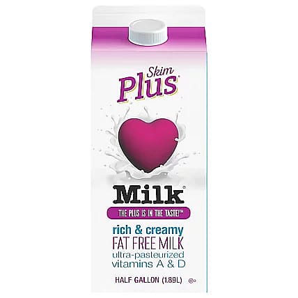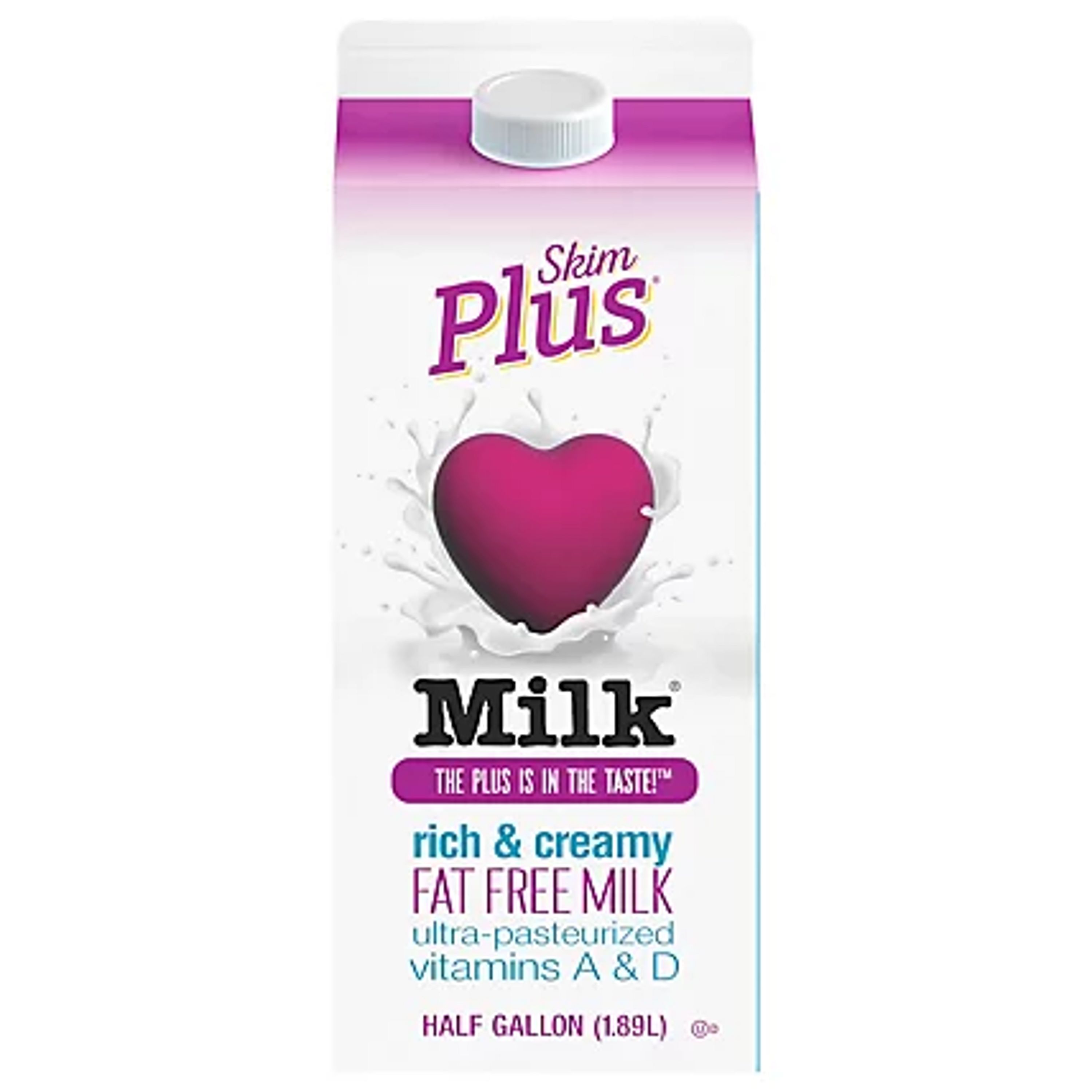 A half‑gallon of rich, creamy fat‑free skim milk made with 100 % real dairy. Skim Plus milk delivers all the essential nutrients of regular milk—protein, calcium, and vitamins A & D—without the fat, offering a lighter, refreshing choice for everyday drinking, cereal, smoothies, or cooking. This fat‑free milk has no added growth hormones and provides a fresh taste that keeps nutrient intake high while calories stay low.