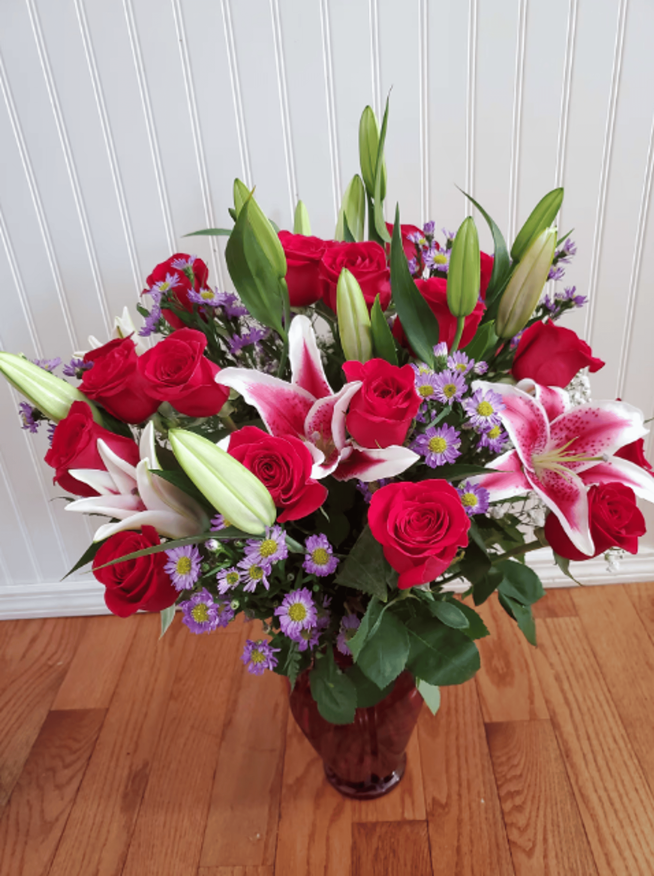 A beautiful vase arrangement in a red or clear vase. 24 Rose's and 5 Stargazer lily's and purple monte casino.