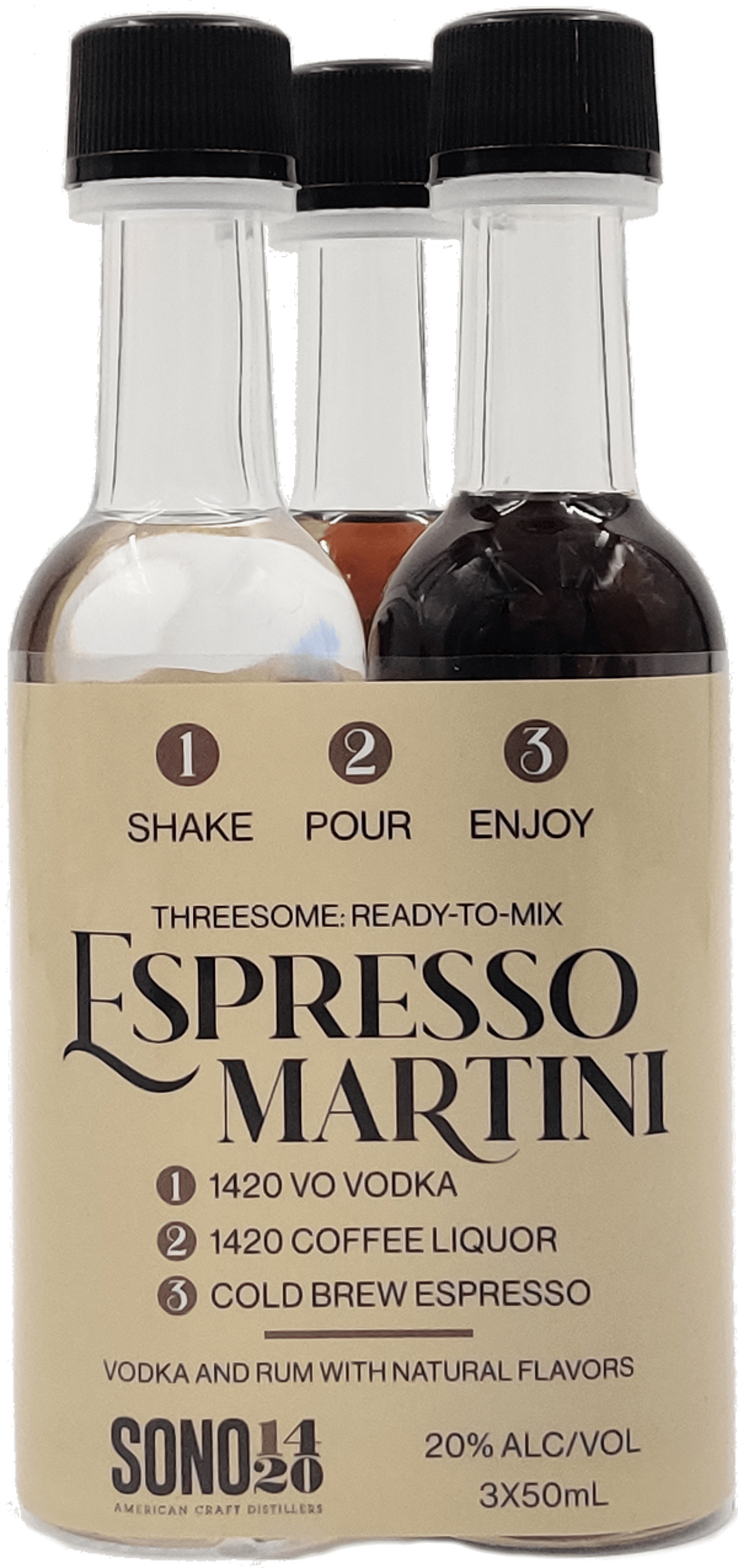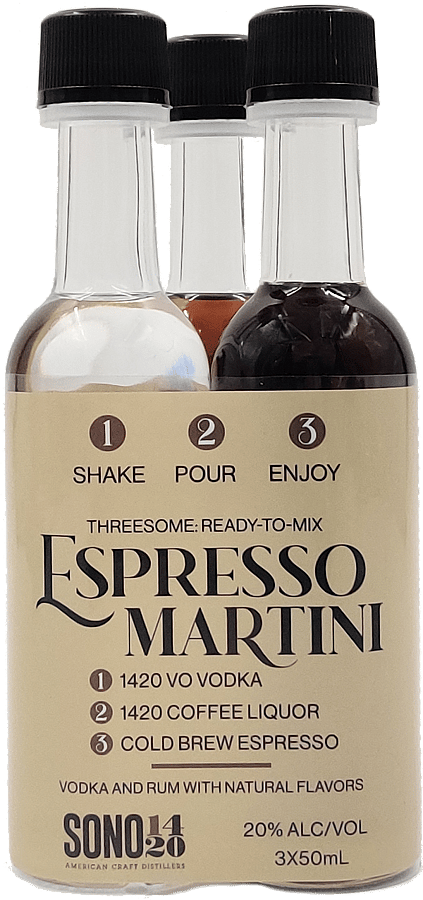 Everyone loves a Threesome, especially our convenient ready-to-mix cocktails! 1. Pop the tops 2. Pour in unison 3. Enjoy a flawless cocktail Made with SoNo 1420 Vo Vodka, cold brew espresso coffee and SoNo 1420 Coffee Liqueur Producer Notes