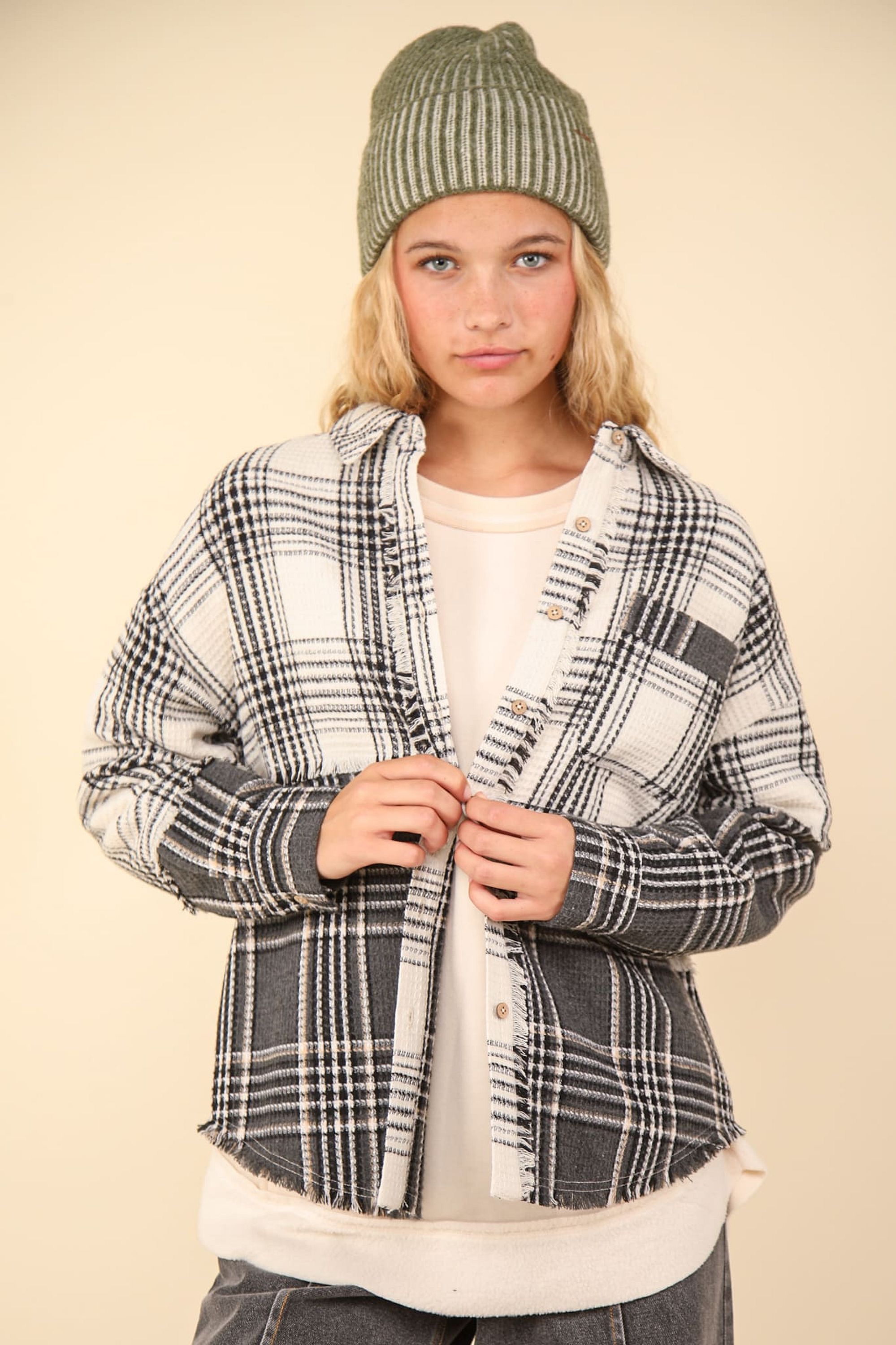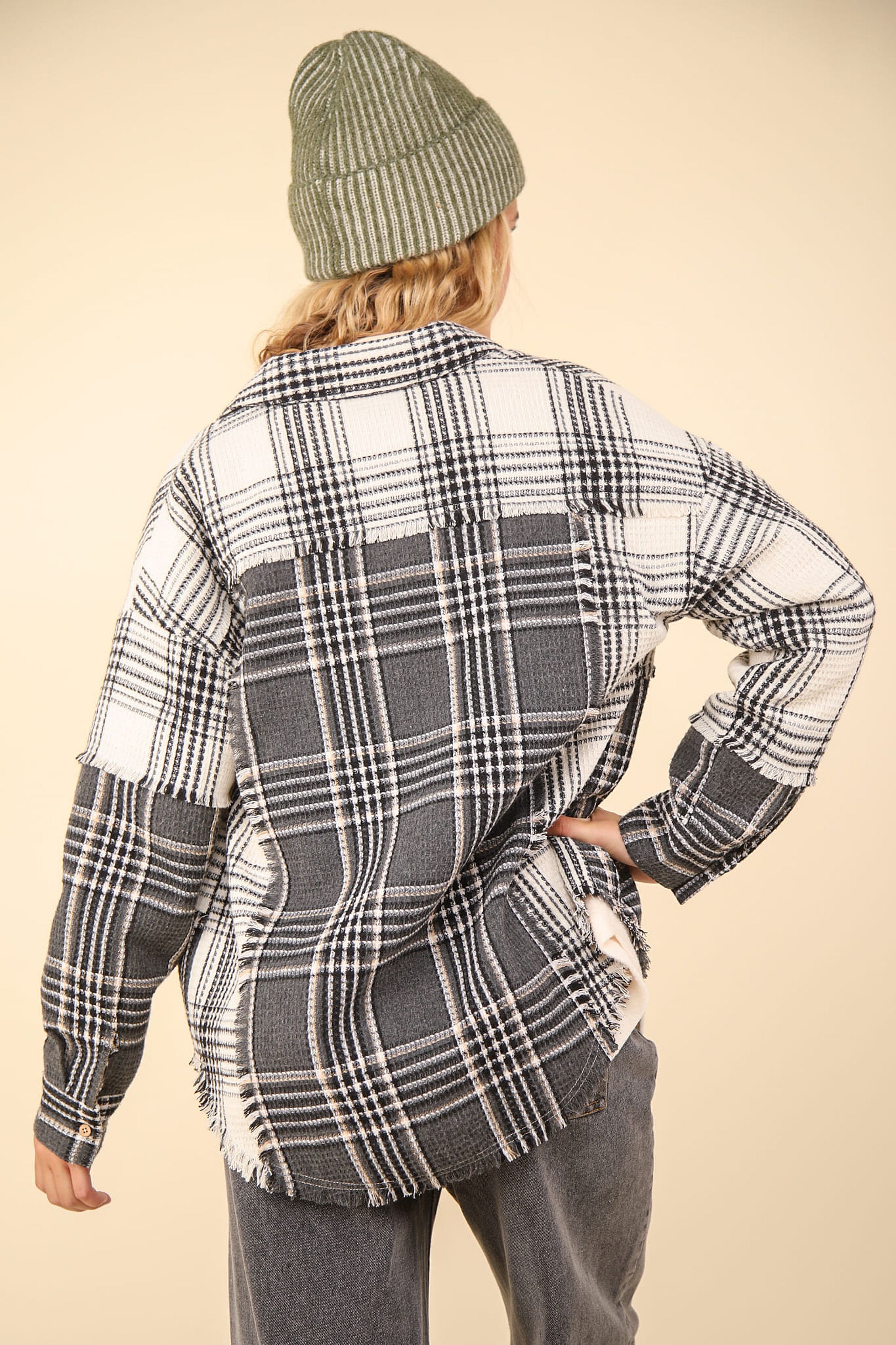 The Mixed Plaid Shacket is the ideal mix of casual and oversized, with a button down design and drop shoulder for a relaxed fit. The long sleeves add extra coziness, while the frayed hem adds a touch of edginess. Don't miss out on this versatile and stylish piece! Runs true to size.