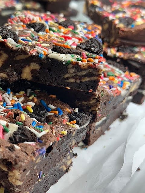 Brownies swirled with house-made peanut butter, studded with Oreos, and finished with sprinkles.