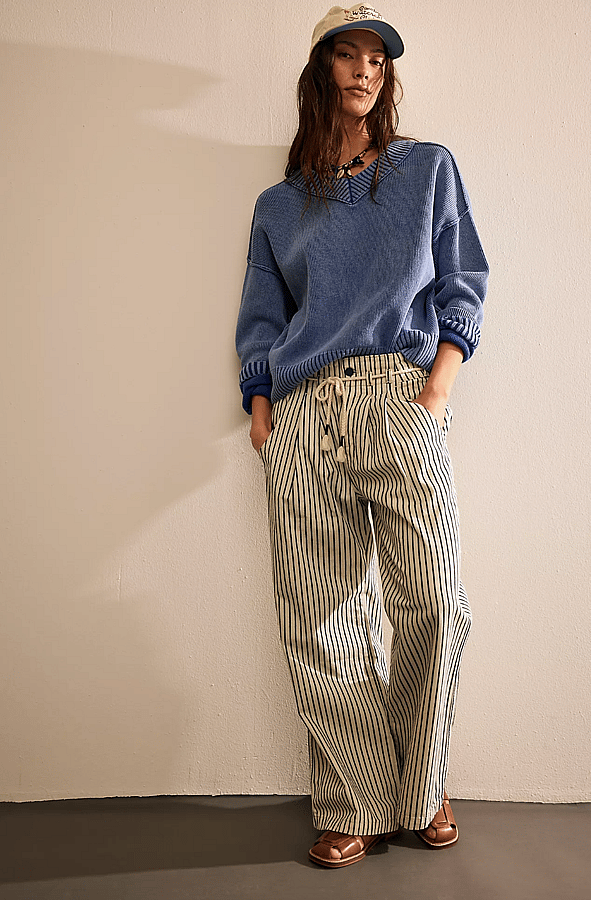 Pull-on design, soft rigid denim, four-pocket styling, pleating at top for added shape, hidden snap closures for adjustable length, classic railroad pattern<br><strong>Why We ❤ It: Off-duty with court sneakers or sleek with slip-on mules, this pair truly has endless ways to wear.