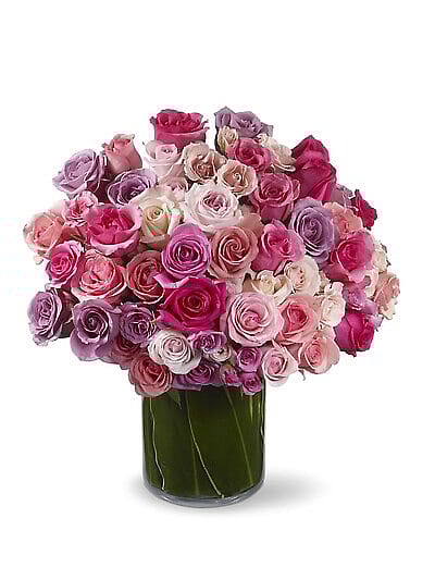 Pack a powerful punch with this multi colored sweetheart (or mini) rose arrangement in a low round vase. Please note Thai leaf availability is seasonal.