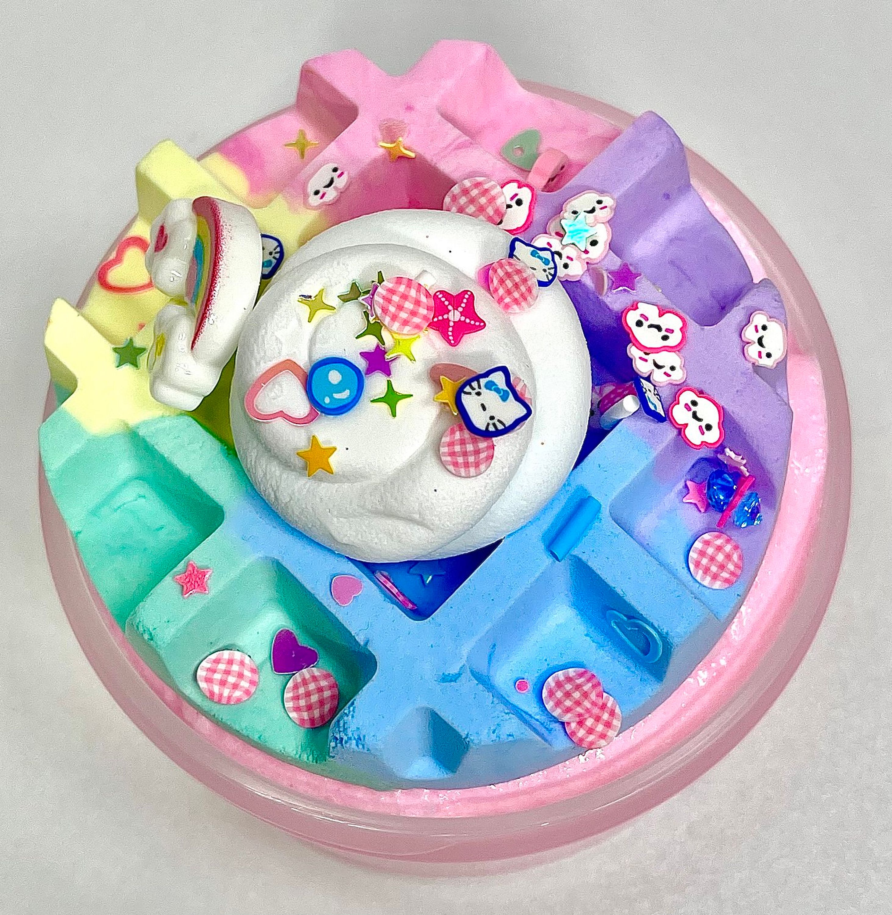 Indulge in Waffletopia, a dreamy pink cloud dough slime that’s scented like a creamy taro milkshake. This delightful slime features a soft, fluffy texture and comes with a pastel swirled clay waffle for a touch of whimsical charm. Perfect for a relaxing, sweet-scented sensory experience, Waffletopia is your go-to for a slice of slime heaven.