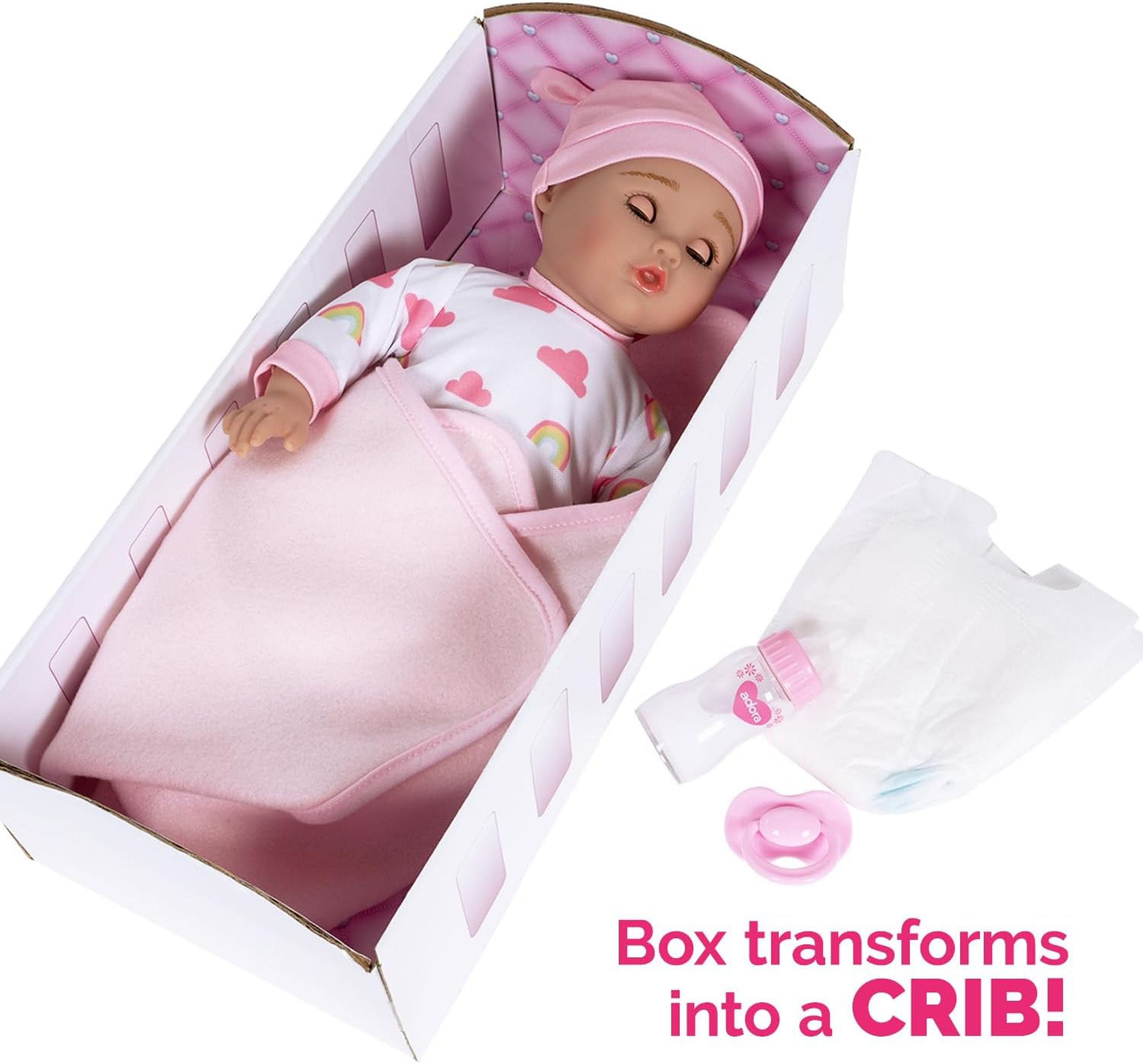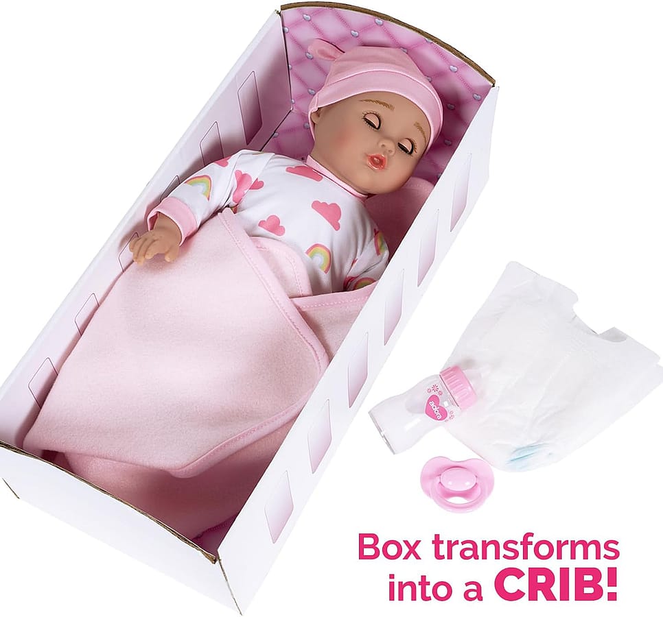 7-PIECE DOLL SET - This Adora Rainbow Hugs baby doll set includes one 13" realistic baby doll with open/close eyes, a rainbow-print onesie, a pink knot beanie, a pink pacifier, a doll diaper, a magical disappearing milk bottle, a pink doll blanket.