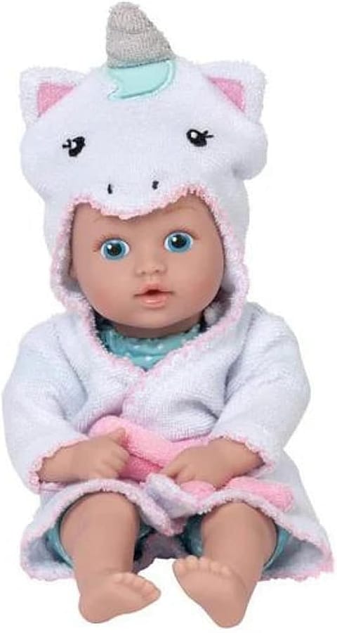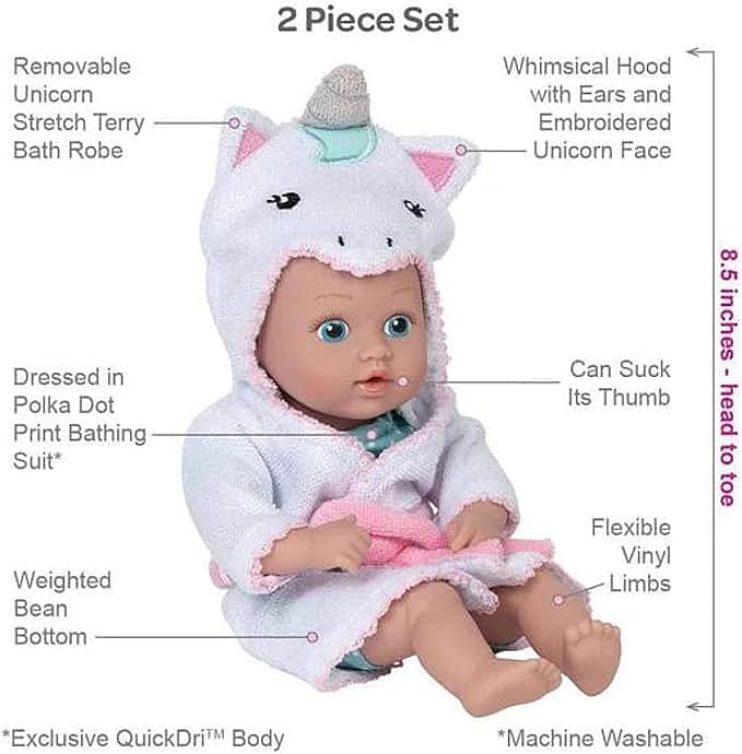 3-PIECE SET - This Adora baby doll and accessories set comes with one 8.5-inch baby doll, an attached blue polka-dot swimsuit, and an embroidered hooded bathrobe