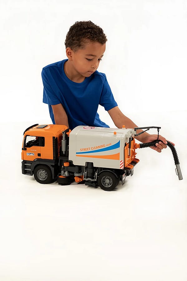 Street cleaners are an indispensable helper for every city administration and are part of the everyday cityscape. No other vehicle ensures clean streets and sidewalks as efficiently. The street cleaner from Bruder shows in great detail how this exciting truck works. The Man TGS is the perfect partner. Robustly built, equipped with powerful engines with up to 500 hp and with an above-average payload, this truck is the prototype for the much-described all-rounder.